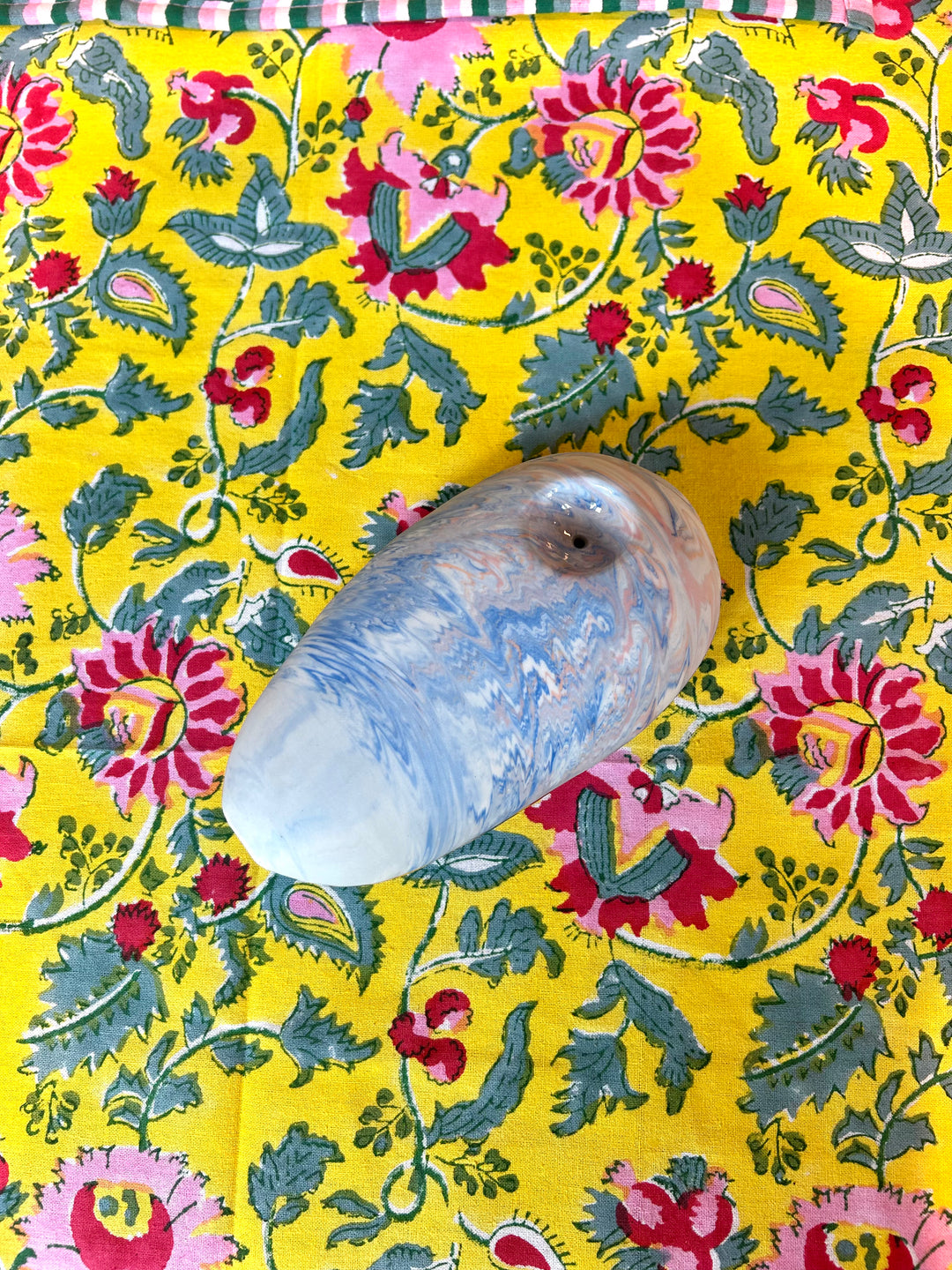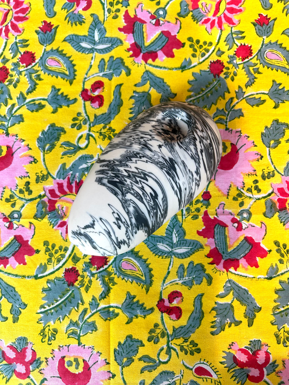 In 2016, artist Bernadette Daroux, fresh from receiving her BFA in Sculpture from Pratt Institute, began making marbled slip cast porcelain objects while doing ceramic production at Joya Studio in Brooklyn, NY. She began selling work at local craft markets all over the city, interacting with buyers and discovering what kind of ceramic objects sparked people’s interest. Working with materials that were available to her in a limited studio environment, she created a line of functional, beautiful objects that are a pleasure to handle. She began making The Pipe Dream in 2019 which became the brand’s most beloved object. In 2021, she began teaching wheel throwing and hand building ceramic classes while working full time as a fabricator for artist Daniel Arsham and fell in love with teaching. In 2022, the brand formerly known as Gold Bear Studio, named after her senior Pomeranian, Foxy, became Bernadette Daroux to connect the woman behind the work to the brand. She currently teaches wheel throwing at Marlene Meyerson JCC and BKLYN Clay and Noble Plateware.