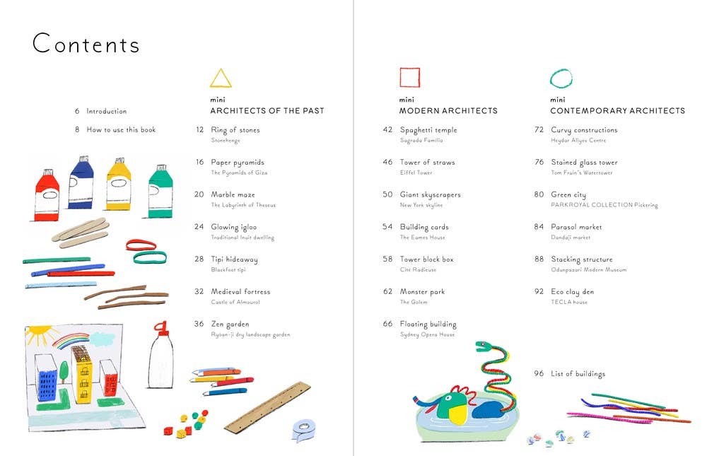 Mini Architects: 20 Projects by Robert Sae-Heng Featuring twenty creative and easy-to-achieve art projects inspired by famous buildings and architectural wonders, this book is designed to help parents, guardians, and teachers to be creative with kids.Designed to engage young children with architecture through creative art projects, Mini Architects takes inspiration from some of the most famous architectural wonders of the past and present, including the ancient Pyramids of Giza, Stonehenge, and Le Corbusier’s Cité Radieuse.Mini architects can choose from a variety of easy-to-make projects using simple materials and featuring a range of interesting techniques, ideal for teaching new motor skills.