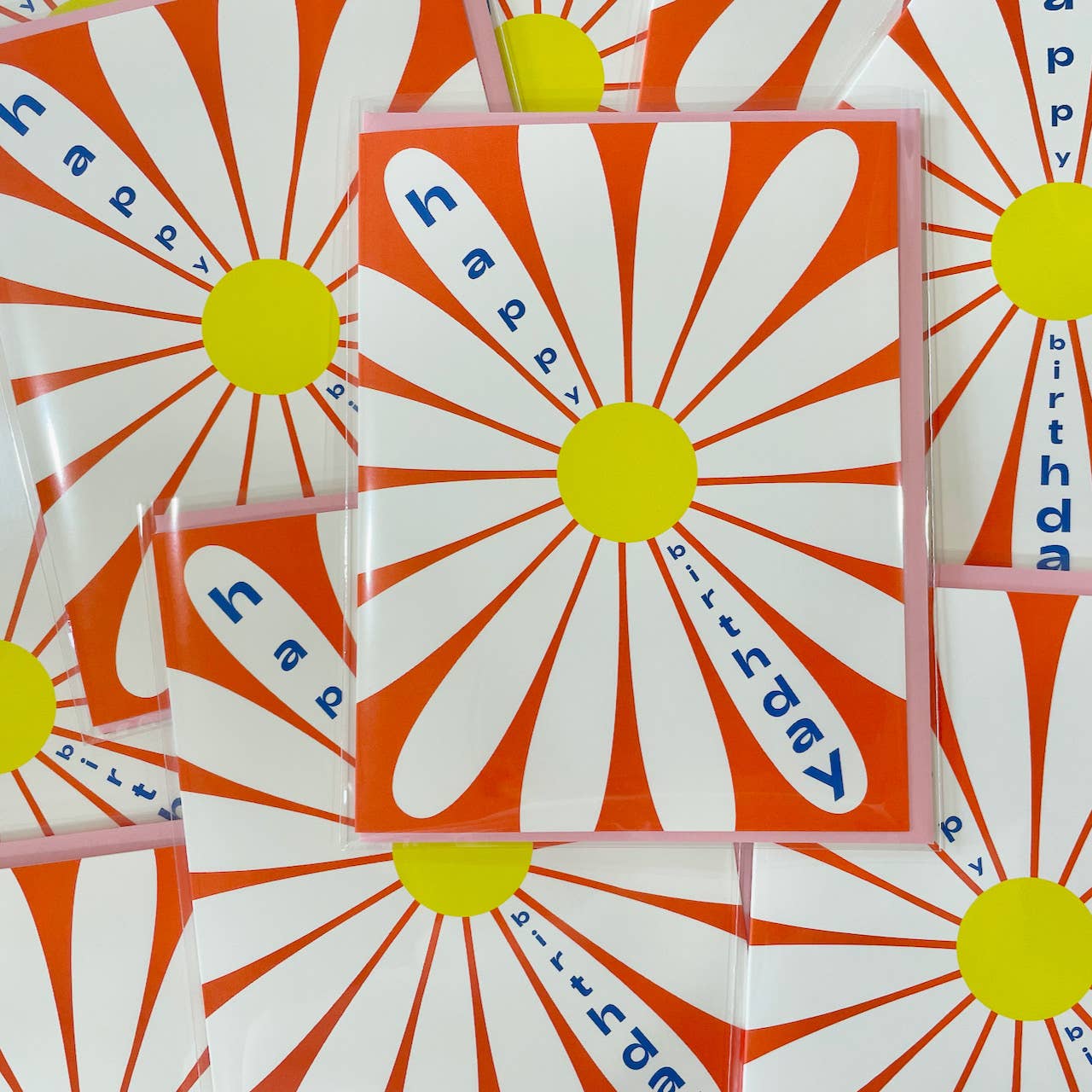 Giant daisy typographic birthday card. • Greeting Card • Blank inside • A2 (4.25" x 5.5") • 100# FSC-certified paper • Comes with a color-coordinated envelope • Packaged in a protective cellophane sleeve • Flat-printed • Printed in the USA
