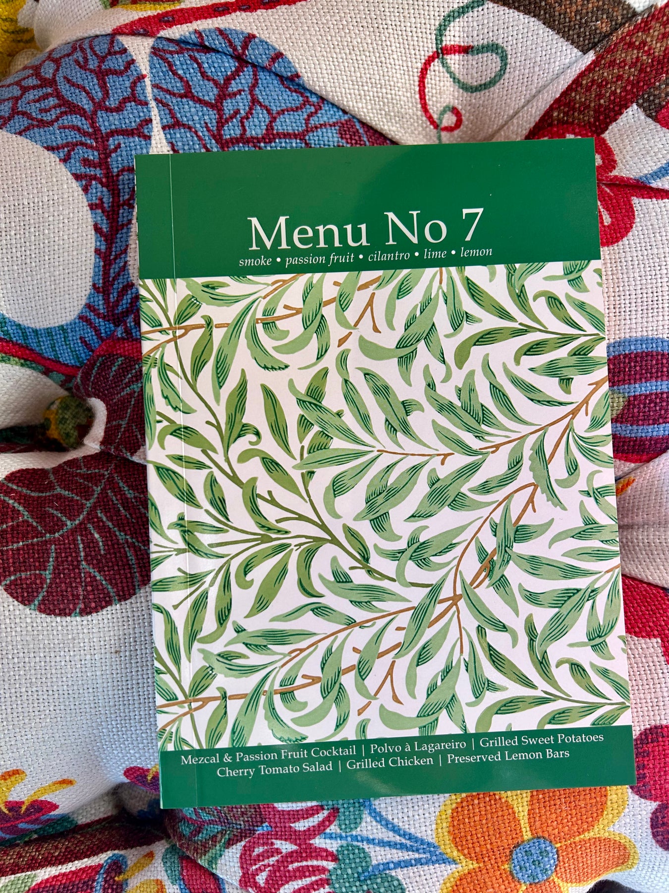 This is one of an imaginative series of small books, each of which offers a charming seasonal dinner menu. There is a confident, thoughtful unpredictability about them which we greatly admire. It’s not every cookbook which cites Sol Lewitt, Leon Trotsky, and Mario Vargas Llosa, but they all have a place here.