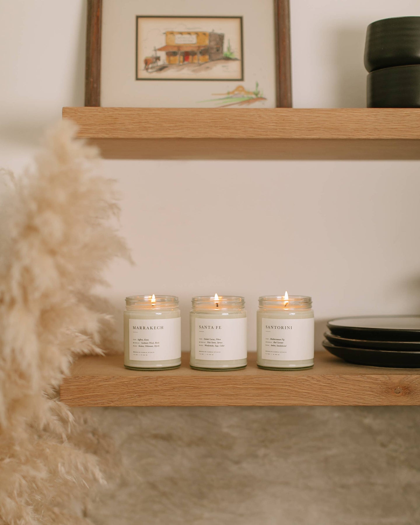 Elegant straight sided clear glass jars with modern minimalist labels. Perfect next to a bud vase filled with freshly picked blooms or your prettiest succulent on a mantle, nightstand, or coffee table. The brushed gold lids instantly make your candle travel-friendly. 7.5 oz jar with lid.