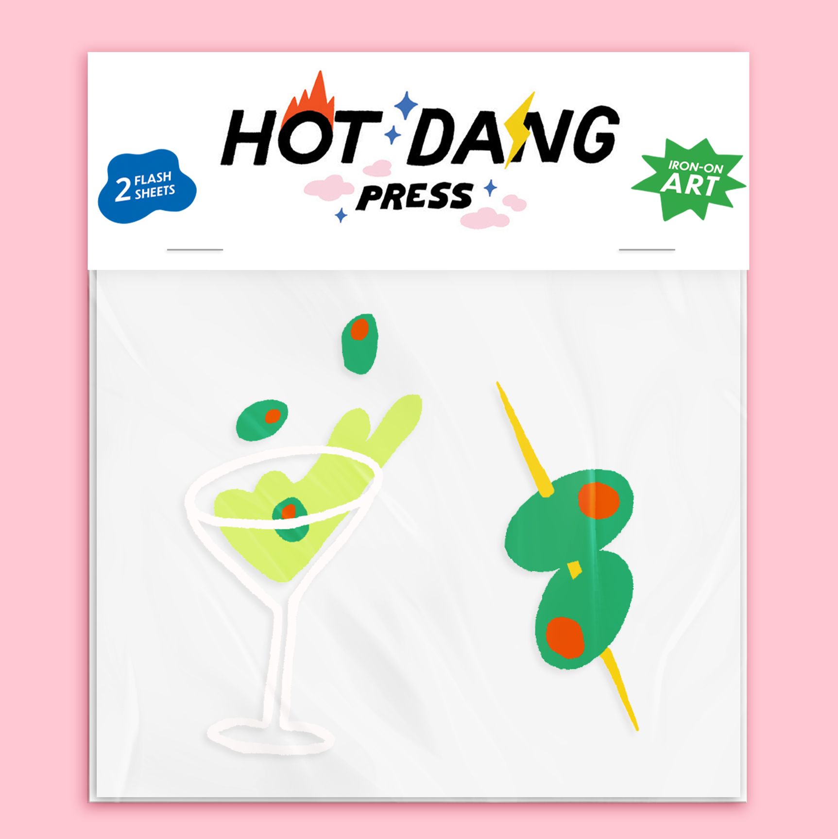 Martini and olive buddies! Iron-on art to customize and enhance your apparel, totes, hats, tea towels, bandanas, handkerchiefs, leather goods, and other treasures. Each buddy set includes two sheets of the displayed illustrations, heat protective parchment paper for application, and easy peasy instructions. You bring the heat! All you need is an iron. Sheets are 3x3 inches.