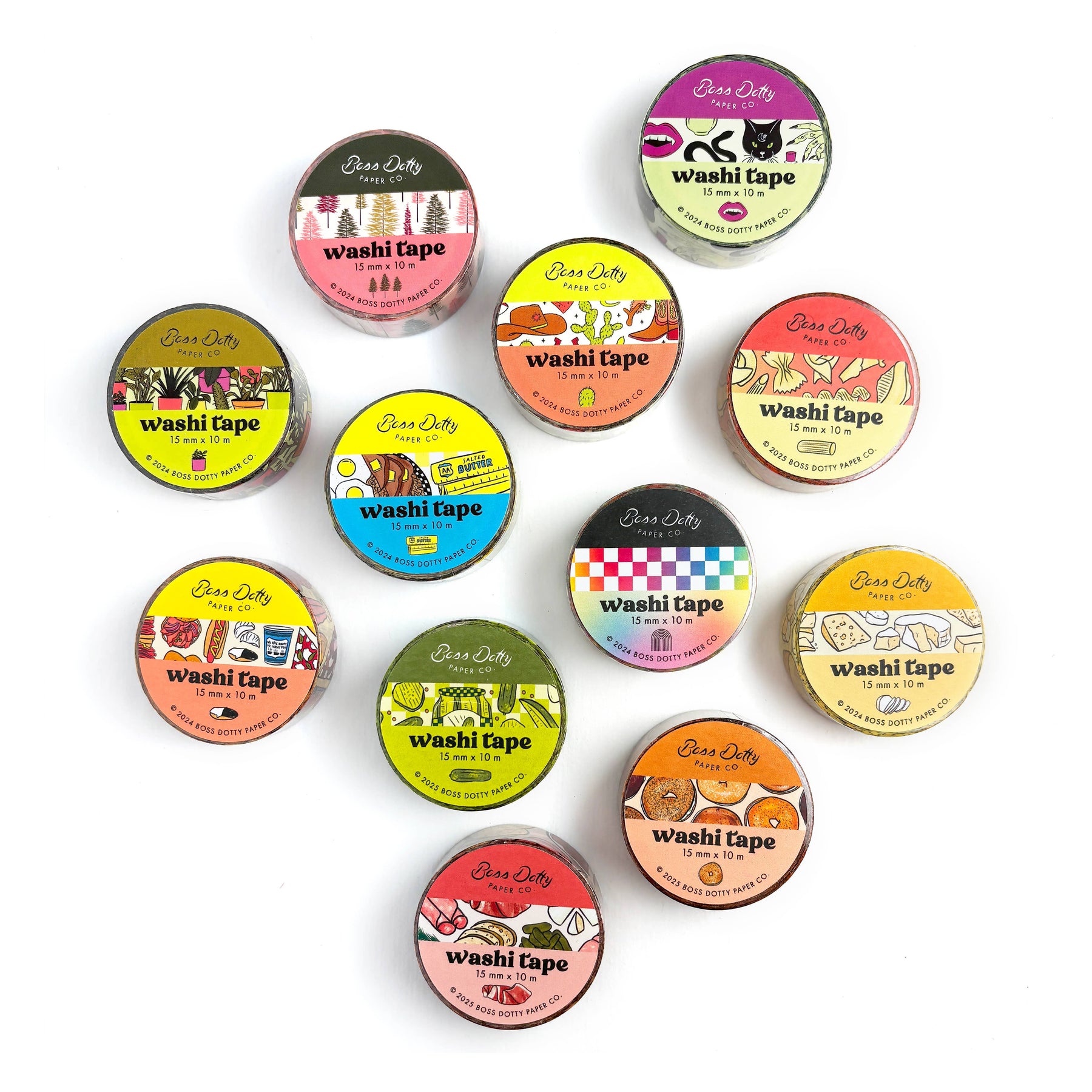 Our ultra-colorful washi tape is printed on semi-transparent traditional rice paper — perfect for journaling, crafting, gifting and more! • Size: 15mm x 10m (.59" x 32.8') • Printed on lightweight, removable rice paper • Packaged in clear shrink wrap and topped with a branded sticker • Features a repeating pattern of cheeses, perfect for cheese and charcuterie board labels, food packaging and more!