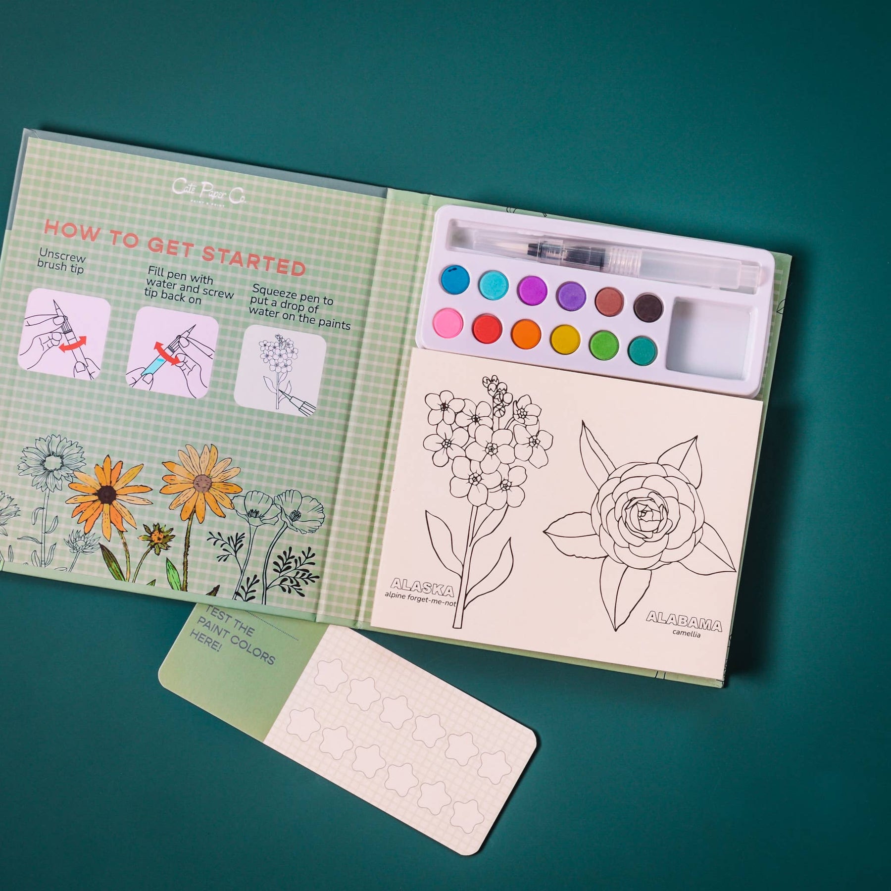 This watercolor painting book and solid watercolor paint set is 24 pages of all 50 state flowers of the USA. Just add water to the paintbrush water pen and paint wherever! The book is a compact and portable art set that can be taken just about anywhere. I T E M • Watercolor painting book • 12 watercolor paints set • water paint brush • 24 painting pages • entire book is 6x7.5 inch size • paint swatch test card