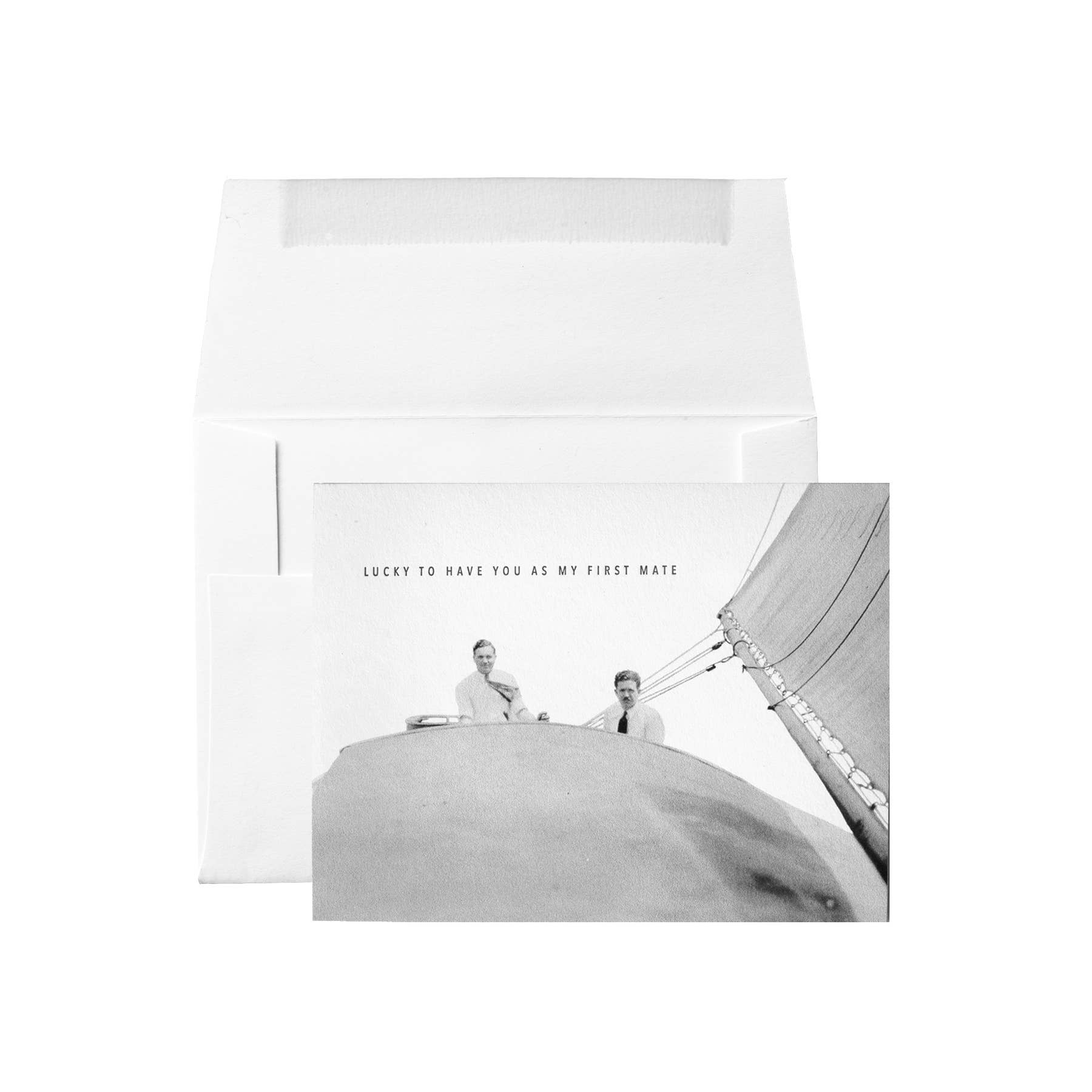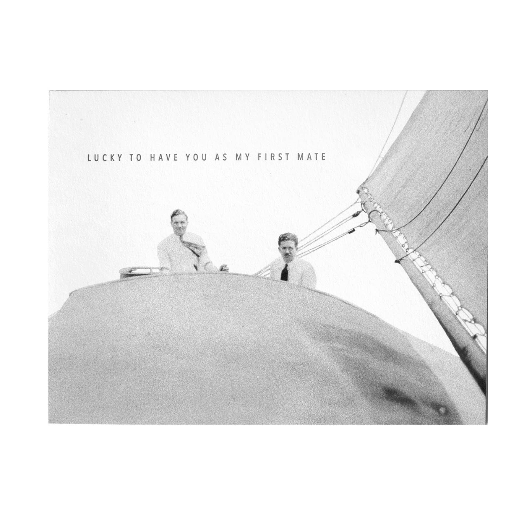 From the Origin Unknown series. Photograph from Beth's collection of anonymous antique photographs. Front image relates to back in Embued's signature card style. Front reads : LUCKY TO HAVE YOU AS MY FIRST MATE Letterpressed. Blank inside. 100% post-consumer white card stock / white envelope