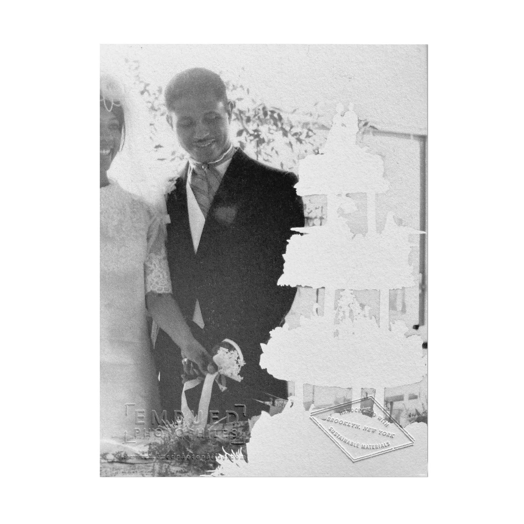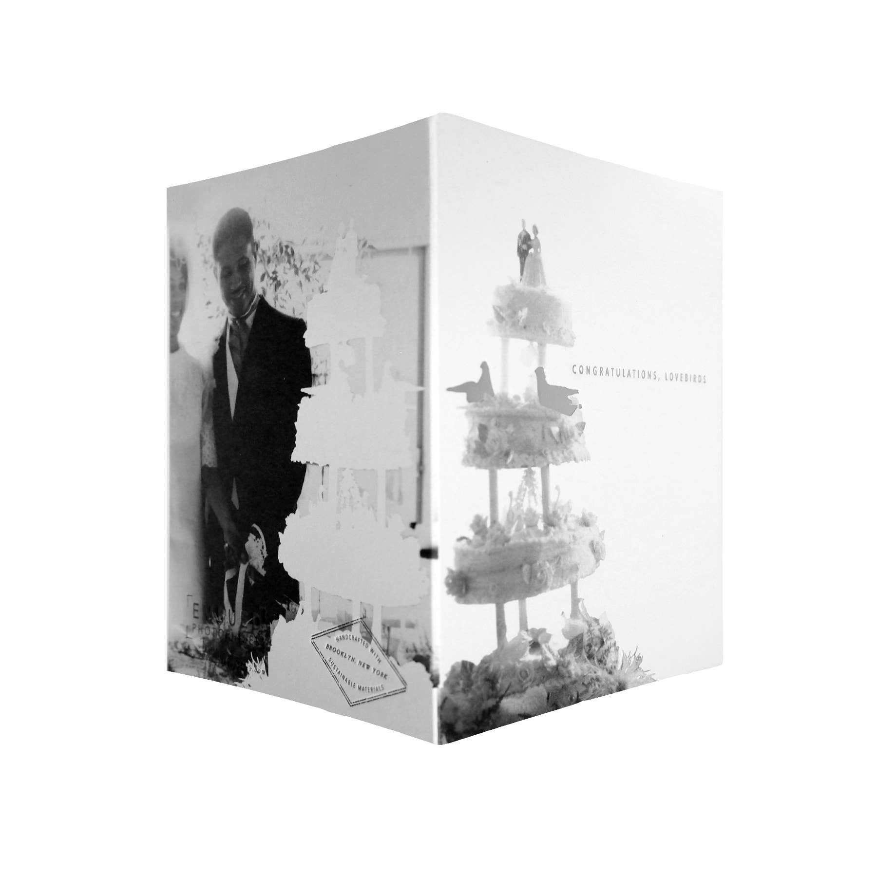 From the Origin Unknown series. Photograph from Beth’s collection of anonymous antique photographs. Front image relates to back. Front reads : CONGRATULATIONS, LOVEBIRDS Blank inside. Foil stamped in silver. 100% post-consumer white card stock / white envelope. Handmade in Brooklyn, NY. Card size : 5.5 x 4.25” folded card