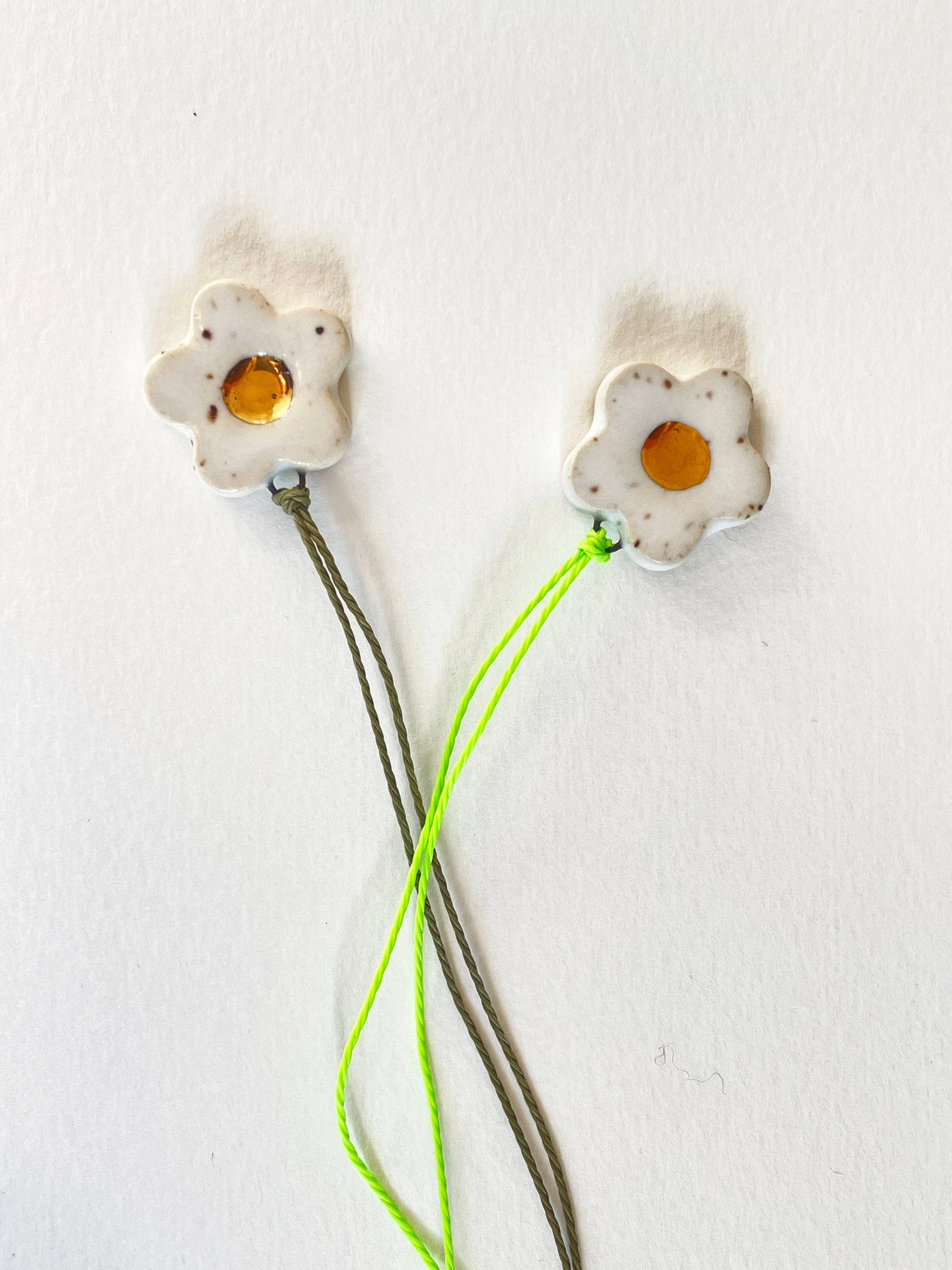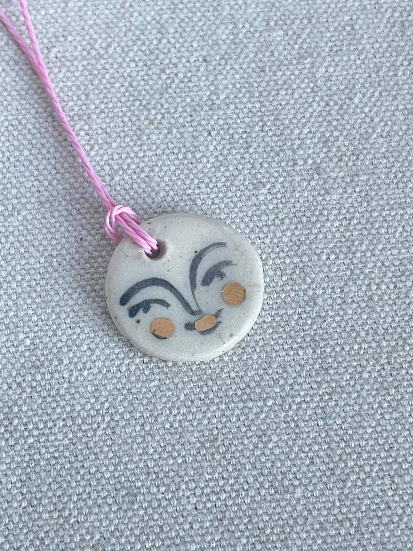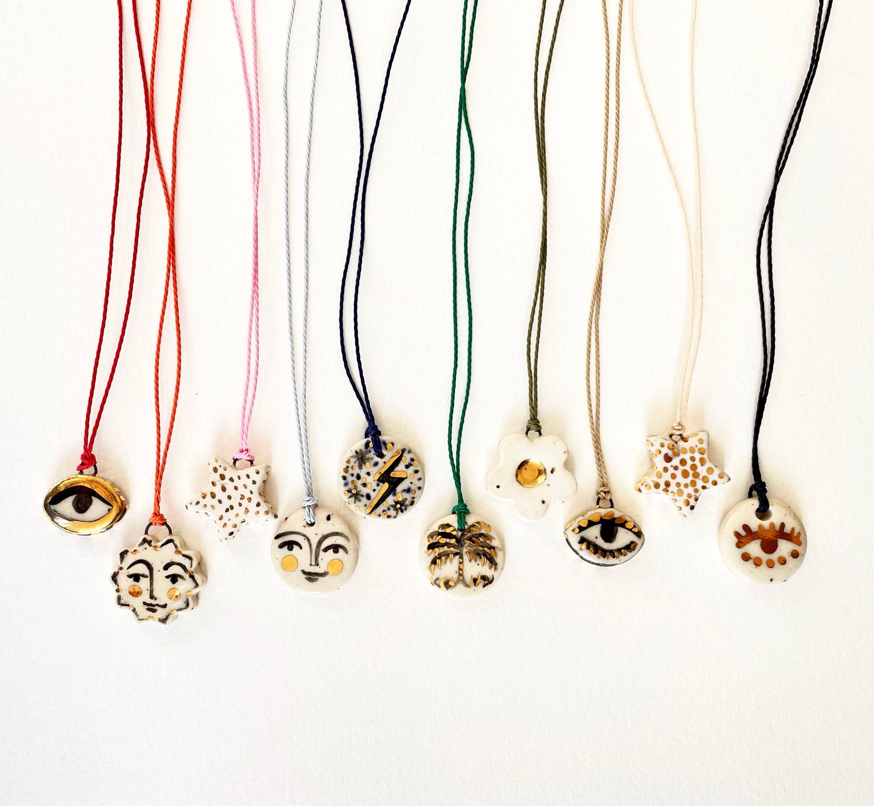 this Charming collection of pendants is the ideal layering accessory. The charms are handmade in stoneware, hand painted and finished with premium quality gold. Set on waxed thread the color of your choice and its size it's adjustable lenghth to fit as a choker to a 20" drop necklace Each piece is handmade one by one and therefore yours might look slightly different that the one picture above.