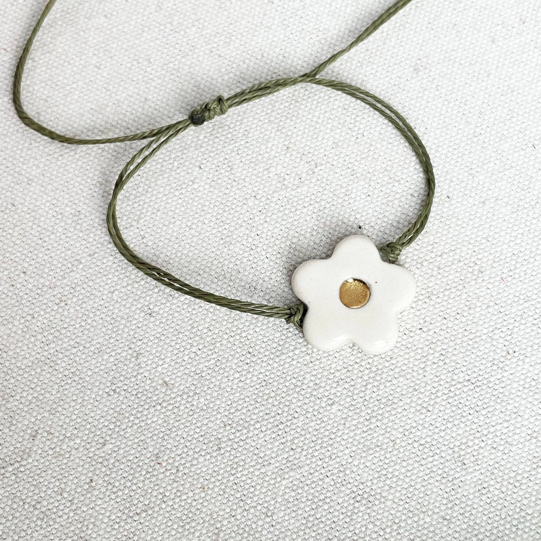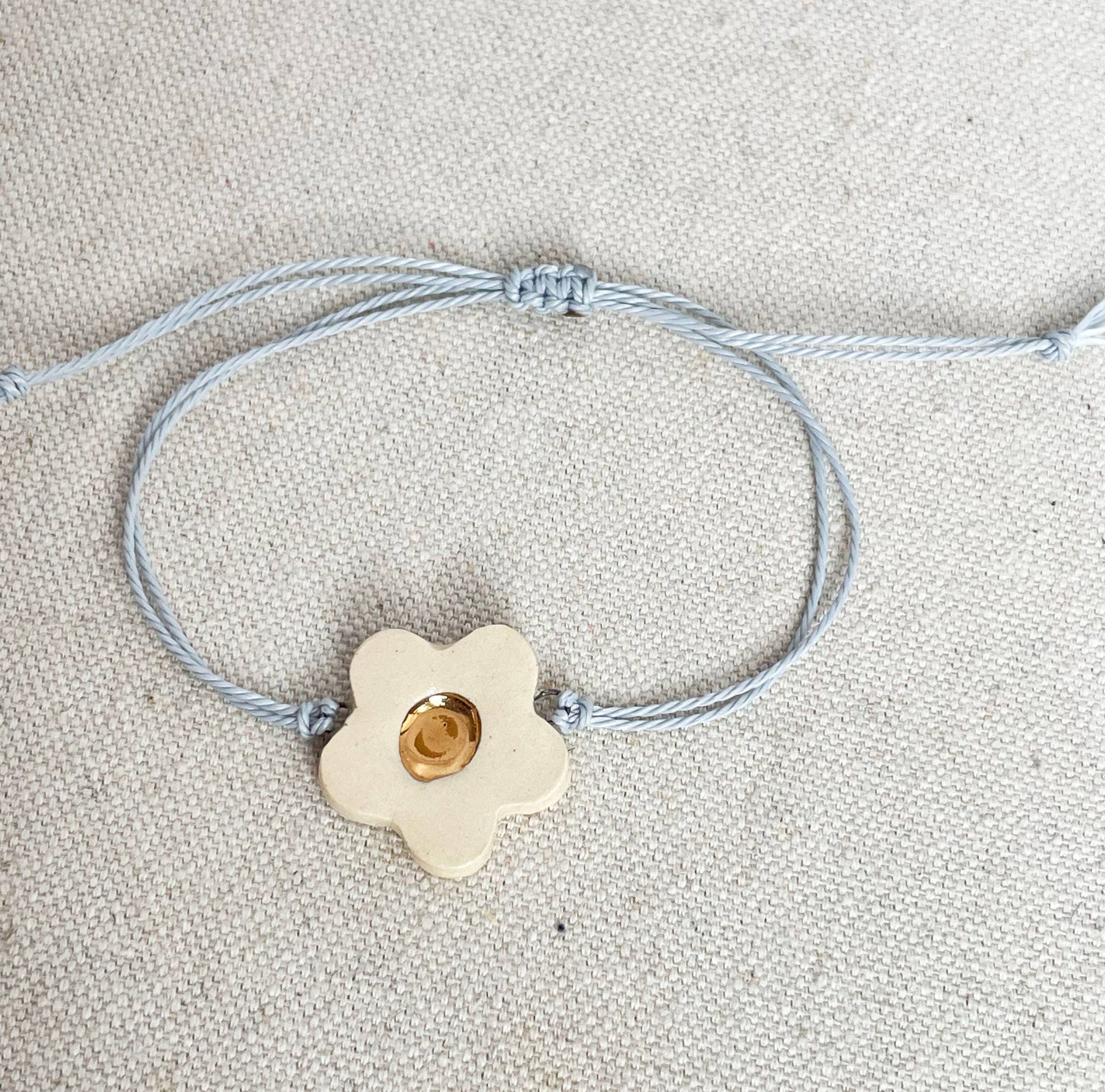 A whimsical accesory that will spark joy and optimism throughout your day. At the heart of this joyfull bracelet lies a carefully crafted daisy shaped charm handmade in porcelain and finished with 24K gold luster. The charm is set on waxed thread that is adjustable in size thanks to its clever sliding knot, fitting almost any size of wrist or even ankles. Note: Each piece is lovingly handmade, and due to the unique nature of the materials and craftsmanship, slight variations may occur, making your piece truly one-of-a-kind.