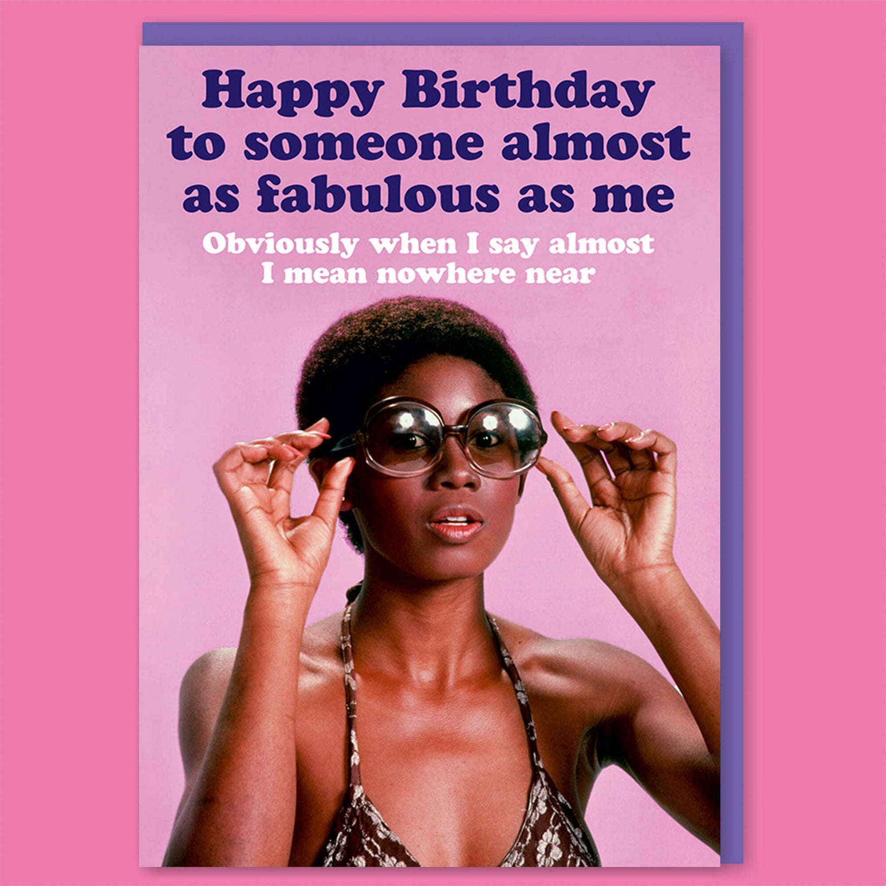 Send this birthday card to your friend to wish them happy birthday of course, but as a little reminder of no matter how fabulous they are they'll never be as fabulous as you. A birthday card featuring a glamourous african american woman in a swimsuit holding up a pair of sunglasses against a dark pink background. Dark blue and white lower case text above reads Happy Birthday to someone almost as fabulous as me. Obviously when I say almost I mean nowhere near.