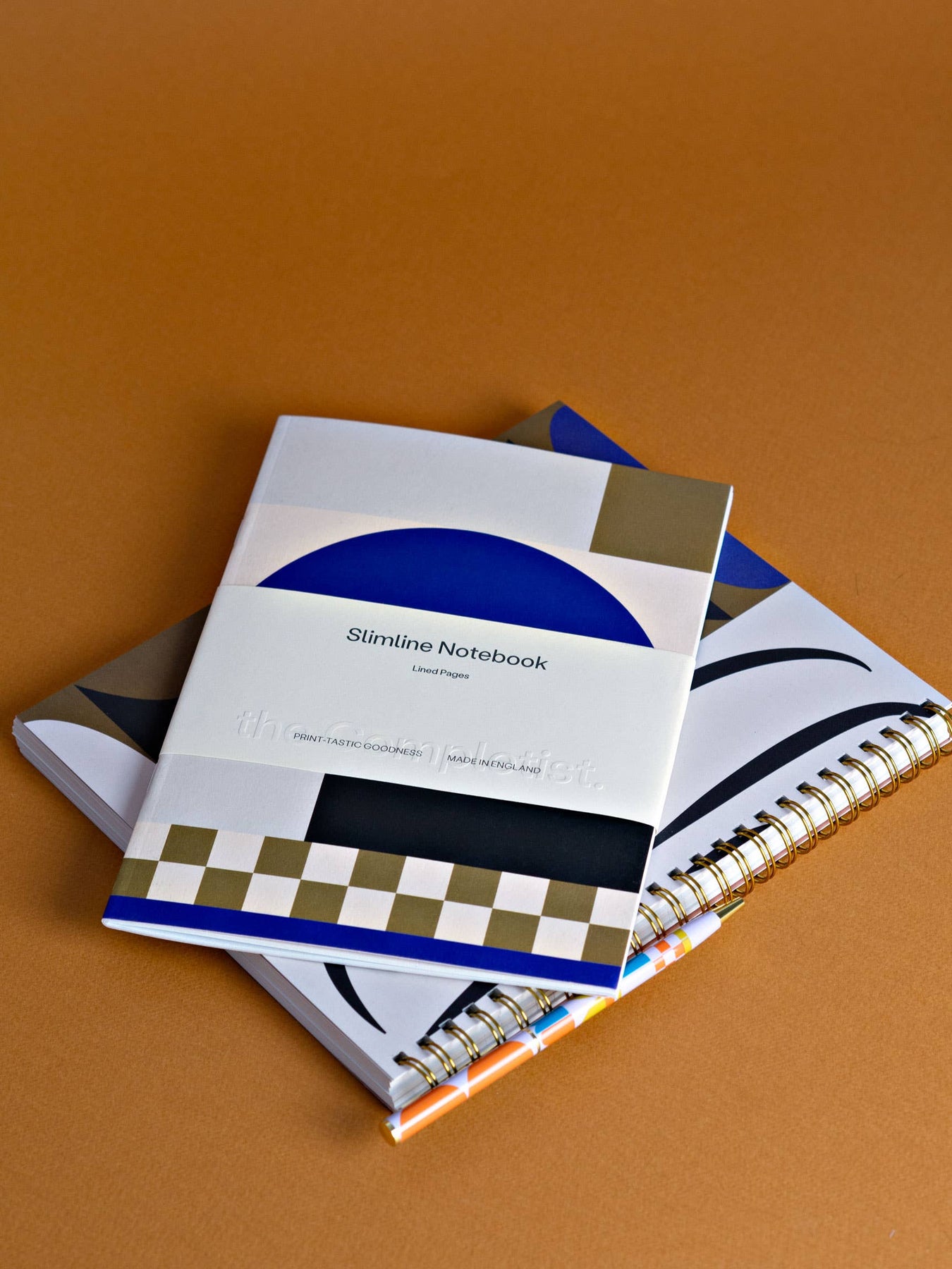 Bold geometry for structured thinking: the Ginger Slimline Notebook features a graphic blue, brown, and off-white cover - ideal for design-conscious customers who want function with a strong visual edge. It’s available with dotted or ruled interiors and makes a stylish, compact addition to any stationery offering. Made in the UK using chlorine-free paper and a heavyweight 300gsm cover, each notebook is staple-bound, giftable, and shelf-ready with a branded belly band and biodegradable film bag. Details: • A5 size (14.8 x 21cm) • 40 pages • Dotted or ruled interior options • 120gsm chlorine-free paper • 300gsm textured cover • Staple-bound spine • Printed and packed in the UK • Includes belly band + biodegradable film bag Great for: Museum shops · Design-led stationery stores · Modern gift buyers · Students + creatives back to school, geometric print, design notebook, A5 ruled, A5 dotted, brown and blue stationery, slimline notebook, UK made, chlorine-free, giftable paper goods