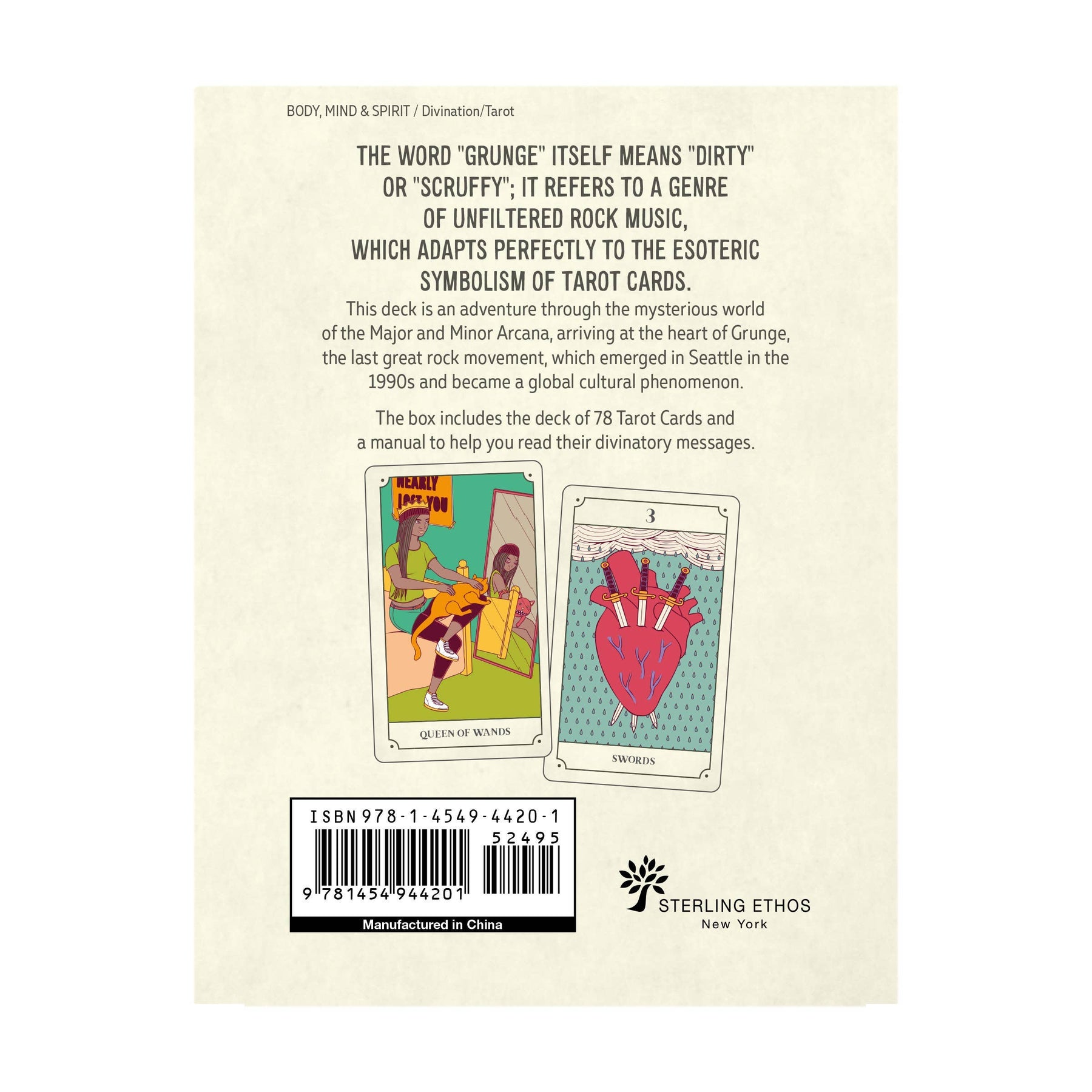 A quirky tarot deck that embraces the culture of 1990s-era Grunge—its fashion, its music, and its personalities. The word "grunge" originally meant dirty, shabby—now it refers to a raw rock sound that jibes well with the esoteric symbolism of tarot. This deck is an adventure that crosses the mysterious world of archetypes to arrive at the heart of the 1990s and Grunge, the music style from Seattle that has become a cultural reference point the world over. A grain of truth can exist anywhere, even in the pockets of an old, checkered shirt, backstage at a concert, or in the doubts and vulnerability of adolescence. Starting from Grunge, this deck of cards aims to recreate the atmosphere of the restlessness of the era, highlighting the search for identity among extremes. It is the dreamy and transgressive imagination of the Fool that begins every path, ready to lose himself or be redeemed. Cards deck; 3.5 x 5.5 inches; 128 pages.