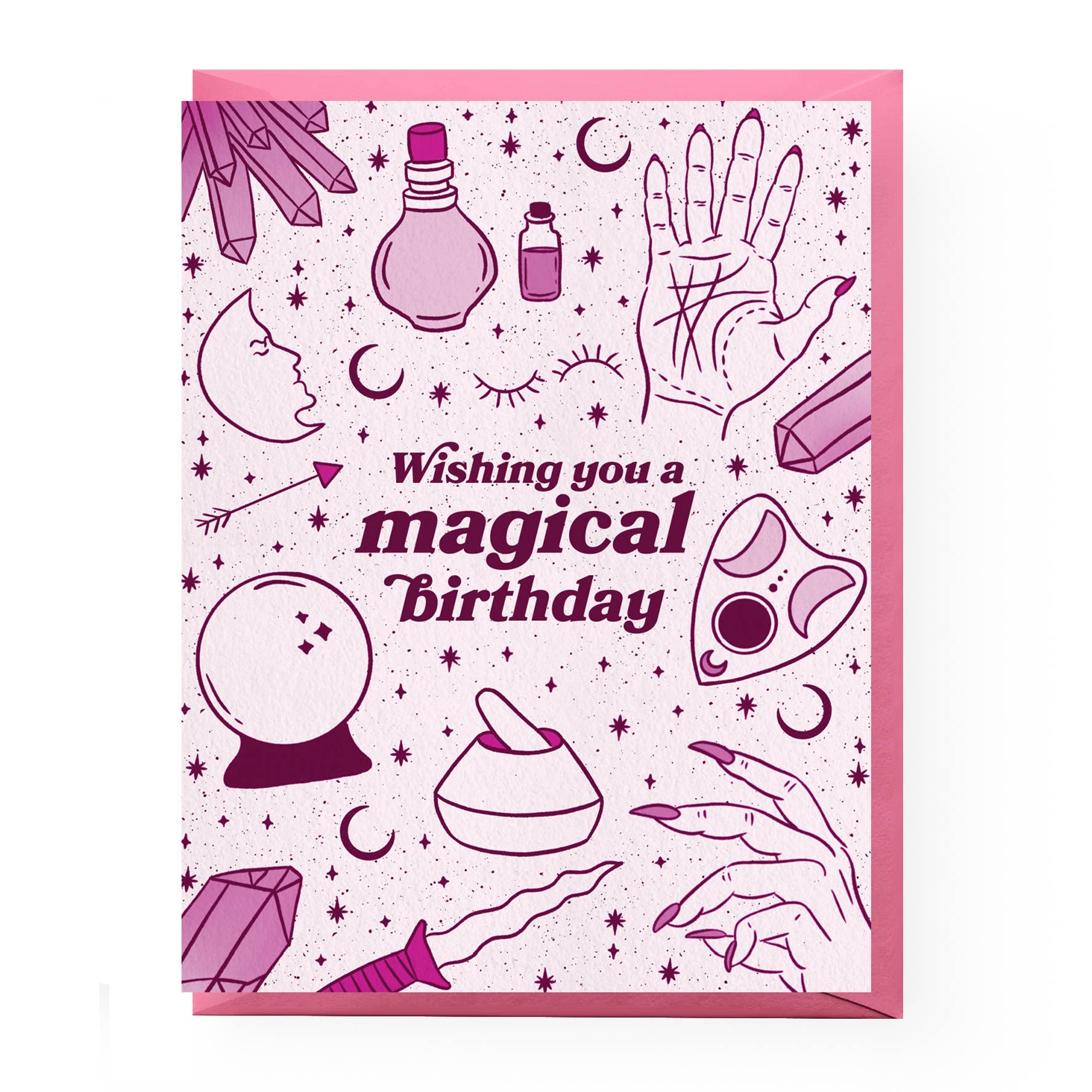 The perfect birthday card for Halloween and for year-round witchy vibes! Printed on 100% recycled paper and paired with a coordinating envelope. Blank inside and sealed in a protective cellophane sleeve. Size A2 (4.25" x 5.5"). Card reads "Wishing you a magical birthday" and features a magical illustrated patterned filled with potions bottles, a crystals and a Ouija board planchette.