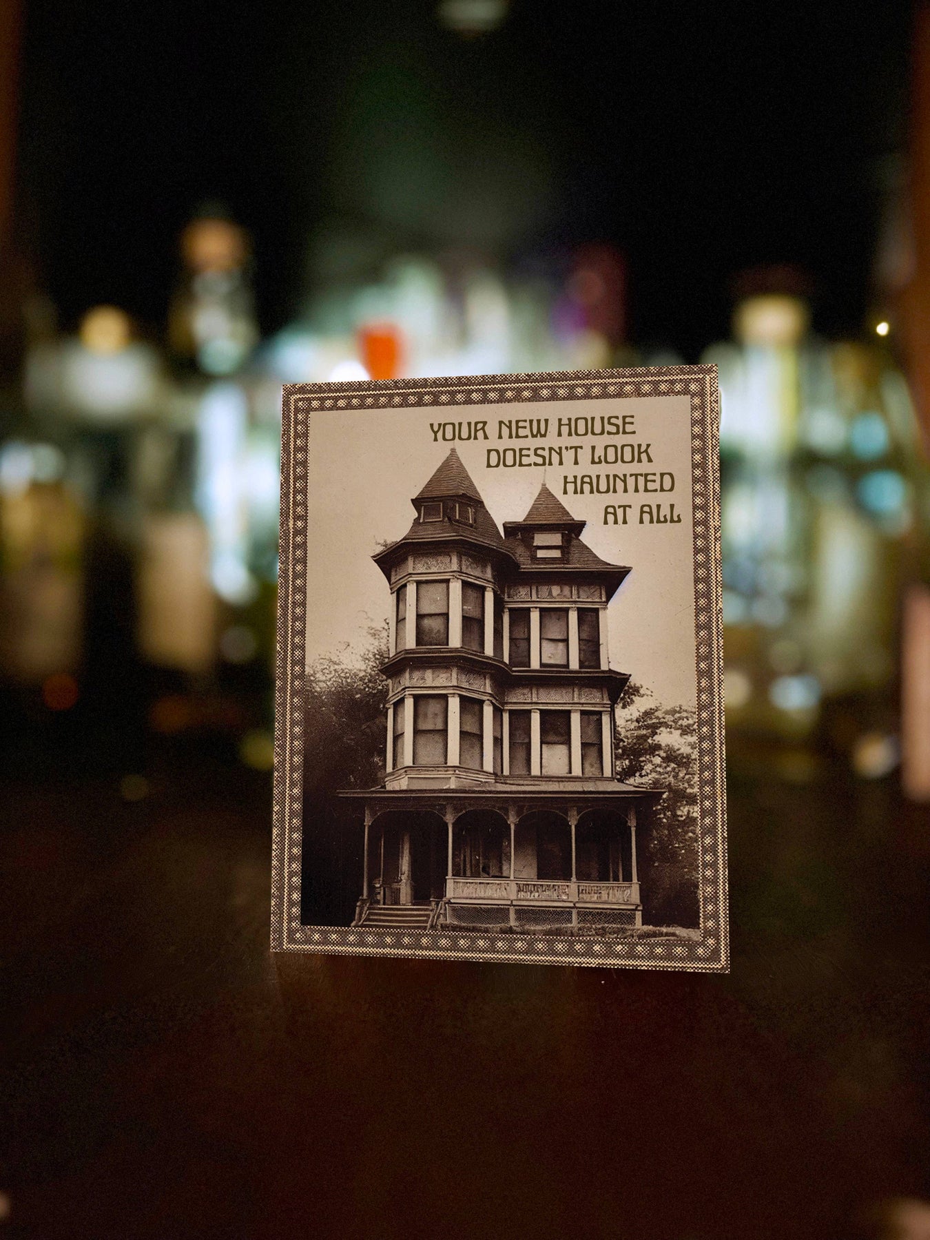 You know when you move into a new place and you hear random sounds coming from the heater and you start wondering if your home was built on an ancient burial ground or something. Fun card for new home owners or moving. Pretty classic victorian house old photo in sepia tones that looks perfect for the Addams Family, Elvira or a bunch of vampires. Printed on high quality 130 pound card stock in vibrant colors! Size A2 card measures 4.75x5.5. Blank inside, comes with an envelope and a protective cello sleeve.