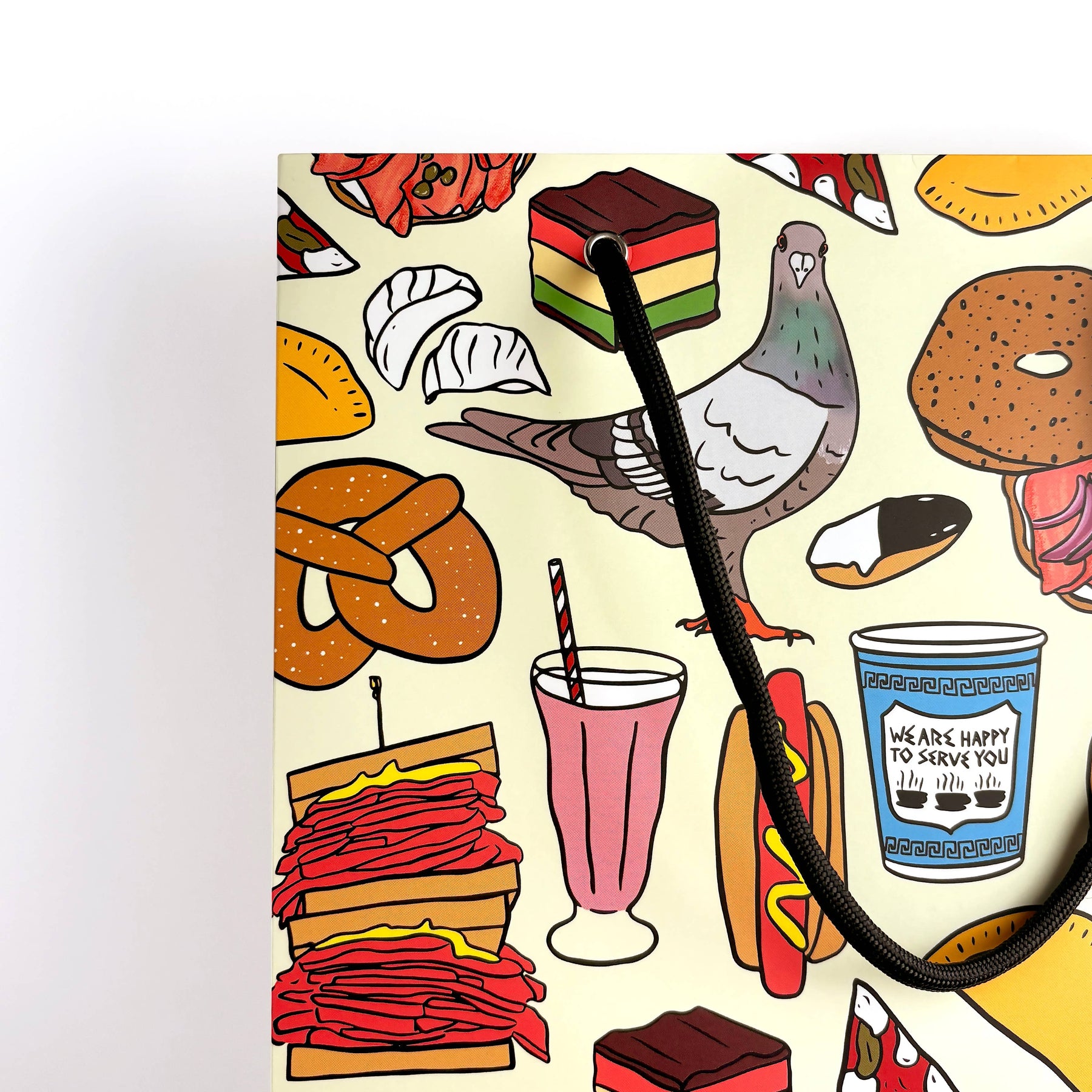 This playfully illustrated gift bag celebrates the delicious chaos of New York City, featuring pigeons mingling with the city’s finest street eats—bagels, hot dogs, pretzels, black & white cookies, and more. Crafted with ultra-durable, sustainably sourced paper stock and coated in a scuff-resistant matte lamination (aka: it’s fancy and tough), this bag is ready to be used again and again—for birthdays, housewarmings, NYC souvenirs and more. Just add tissue paper and go! • Size: 9.6" W x 13" H x 4.5" D (comfortably fits three wine bottles, plus room for snacks!) • Folded upper lip, metal grommets, and black braided rope handles • Printed edge to edge in full color • Gusseted sides and a reinforced flat bottom for extra support • Designed in Brooklyn and made in the USA • Features an illustrated pattern of pigeons among New York City's finest foods, including bagels, hot dogs, pretzels, black & white cookies, and more!