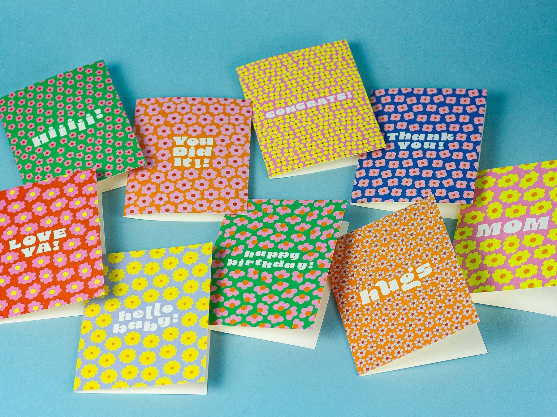 You did it! A celebratory card with cheerful florals to commemorate a happy occasion. Great as a graduation card, retirement congrats, or to mark any number of milestones or successes. Part of BOOM BOOM BLOOM, a series of flower pattern cards blooming with vibrant color and retro typography for an overall vintage vibe. • Greeting Card • Blank inside • A2 (4.25" x 5.5") • 100# FSC-certified paper • Comes with a color-coordinated envelope • Packaged in a protective cellophane sleeve • Flat-printed • Printed in the USA