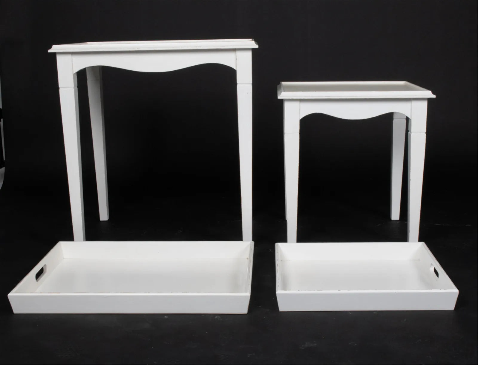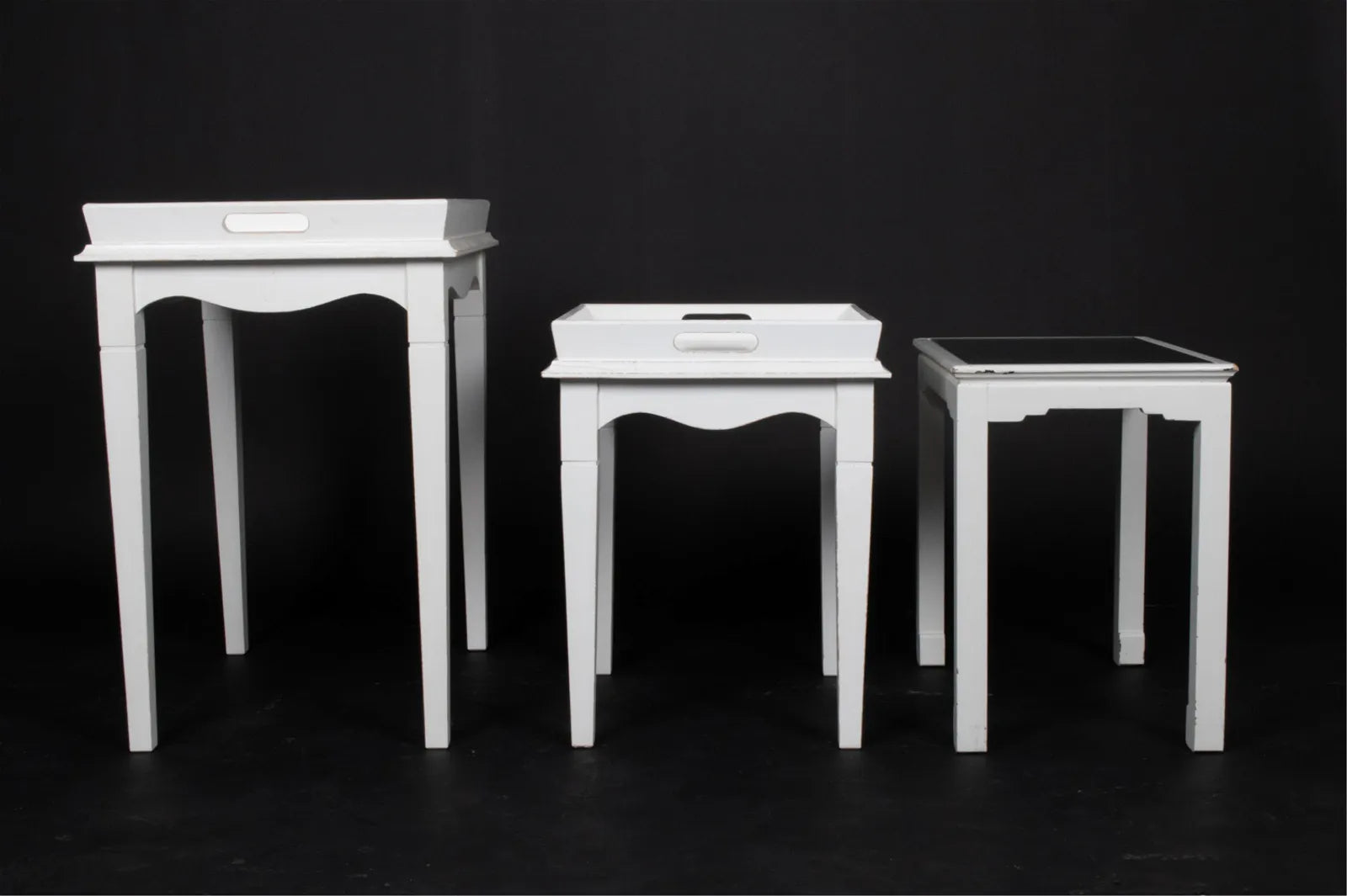 Including two with tray tops, one with mirrored top. Dimensions: (Larger tray top) H 27" x W 24" x D 18" Condition: Intentionally worn paint surfaces. Few additional scratches, paint nicks, and marks consistent with use.