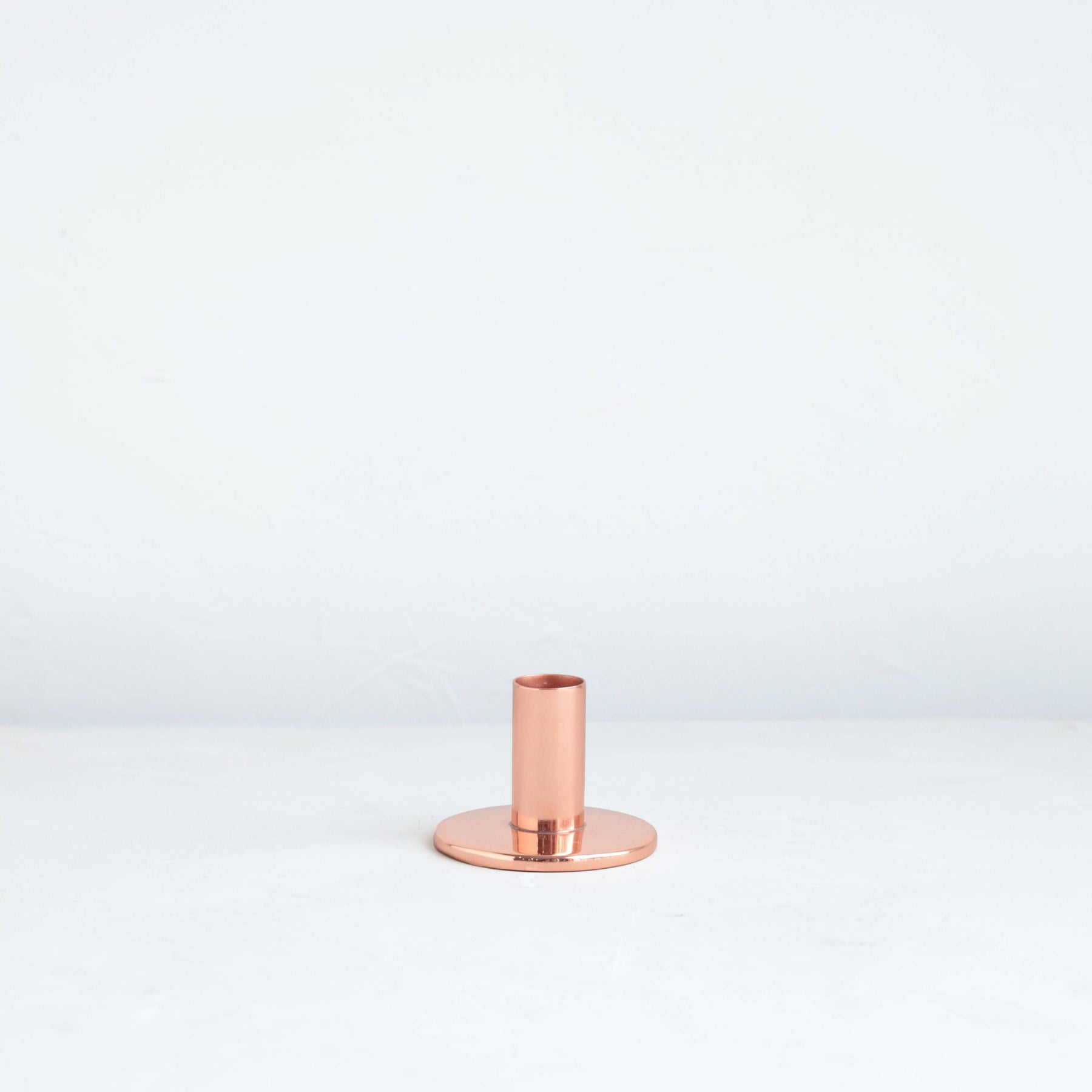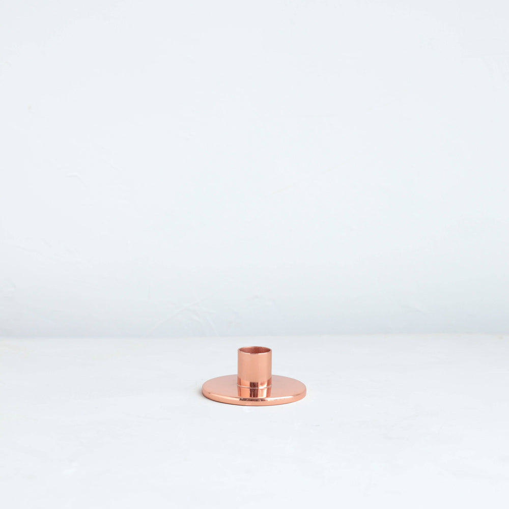The perfect companion to our taper candle collection, our copper taper holders are a sleek, modern way to add a lustrous accent to any space. Each copper plated holder is sized to fit a standard taper candle. Due to the handmade nature of this product, slight form variations may occur. We suggest using our Copper Candle Sharpener and Candle Helper to fit tapers easily. Made of copper plated stainless steel and hand finished. Short: 3" D x 1.25" H Medium: 3” D x 2.25” H Designed by The Floral Society