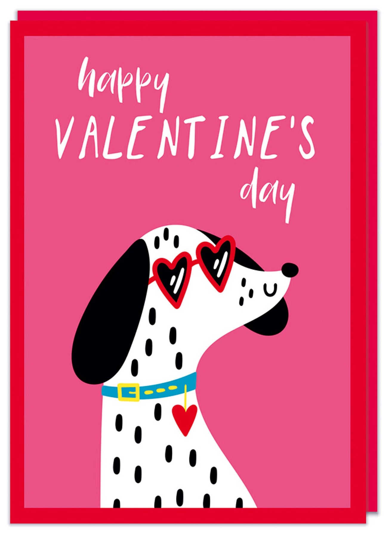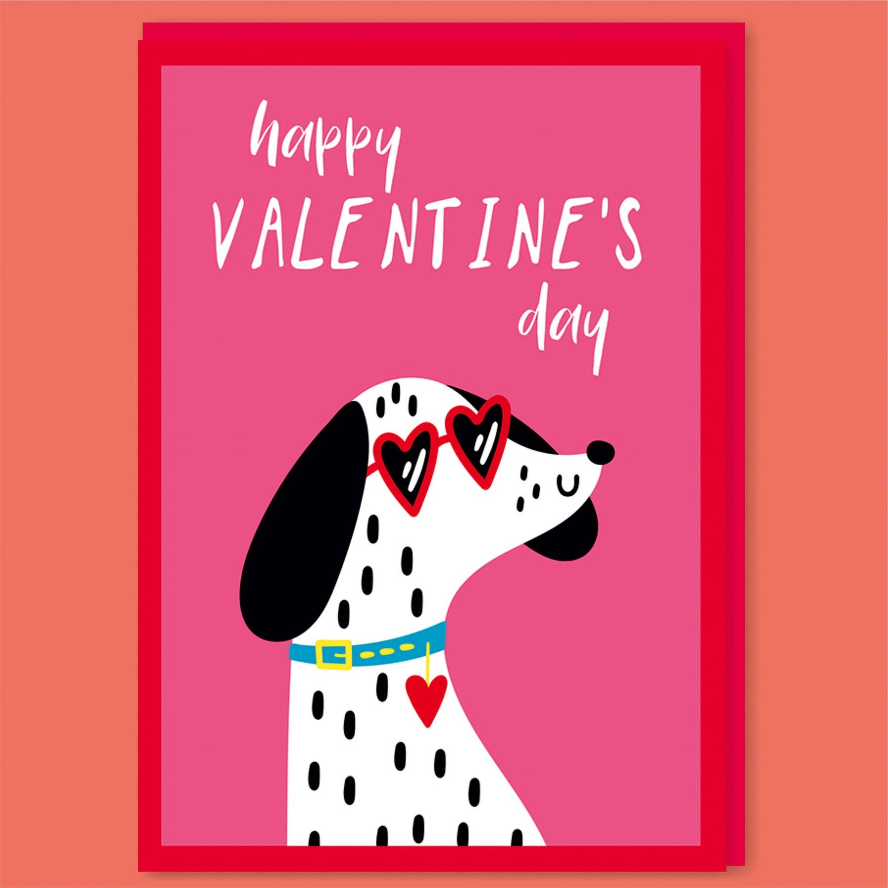 Even if you're not a big romantic dalmatian with heart shaped shades this might be the perfect Valentine's Day card you can send. ` A cute Valentine's card with a deep red border and inside is an illustration of a cute dalmatian dog wearing heart shaped shades. Simple text above reads Happy valentine's day.