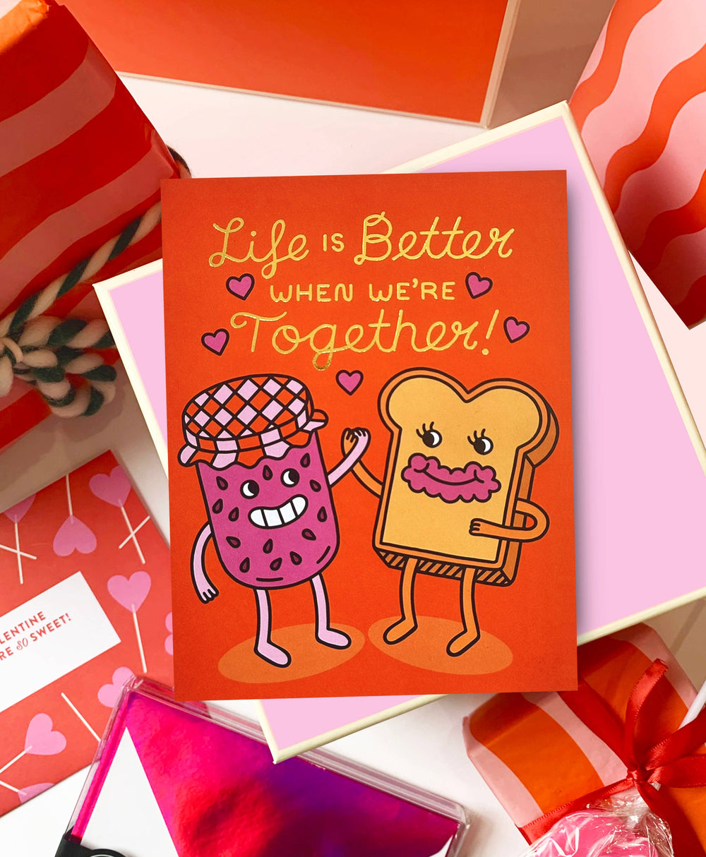 Greeting: "Life Is Better When We're Together!" (Blank Inside) Printing: Gold Foil Card size: 5.5" x 4.25", Folded Paper: thick colored stock with coordinating A2 envelope Illustrated by Danny Miller