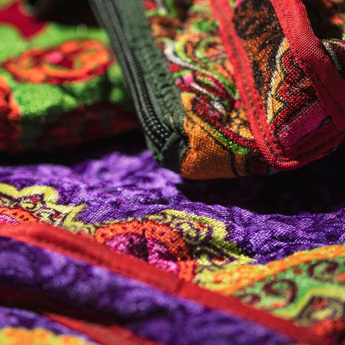 A military icon, reinterpreted. Steeped in history yet effortlessly modern, Mao’s Helmet Bag is a quiet statement of utility and style. Crafted by hand from repurposed fabric, each piece carries the subtle imperfections and rich patina of its past and no two bags are ever the same. The result is a design that feels storied, lived-in, and undeniably cool. Purple, Blue, Brown, Red, Green, Dark Brown Approximate Size: L19 x W19in. Material: Polyester, Recycled Fiber, Repurposed Belt Design: Assorted Note: Each piece features a unique pattern, determined by fabric availability. Made from recycled, quilted fabric originally used for bedding in India, it carries natural imperfections. These unique characteristics may include stitch marks, holes, and a textural, timeworn finish that are formed during production. While not intentionally distressed, this raw texture is embraced as part of its new identity.