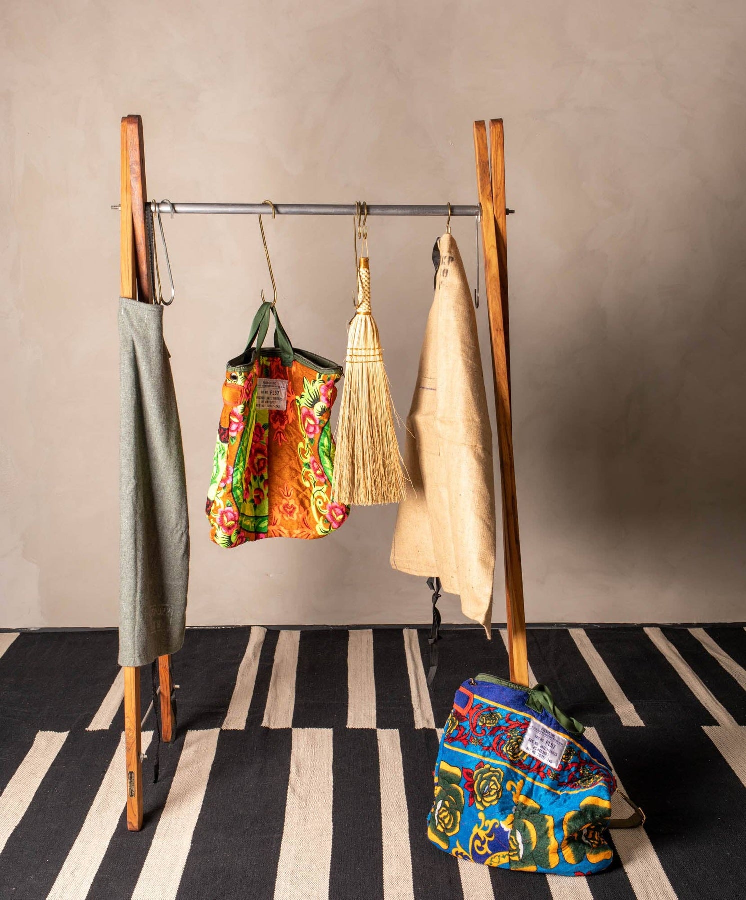 A military icon, reinterpreted. Steeped in history yet effortlessly modern, Mao’s Helmet Bag is a quiet statement of utility and style. Crafted by hand from repurposed fabric, each piece carries the subtle imperfections and rich patina of its past and no two bags are ever the same. The result is a design that feels storied, lived-in, and undeniably cool. Purple, Blue, Brown, Red, Green, Dark Brown Approximate Size: L19 x W19in. Material: Polyester, Recycled Fiber, Repurposed Belt Design: Assorted Note: Each piece features a unique pattern, determined by fabric availability. Made from recycled, quilted fabric originally used for bedding in India, it carries natural imperfections. These unique characteristics may include stitch marks, holes, and a textural, timeworn finish that are formed during production. While not intentionally distressed, this raw texture is embraced as part of its new identity.