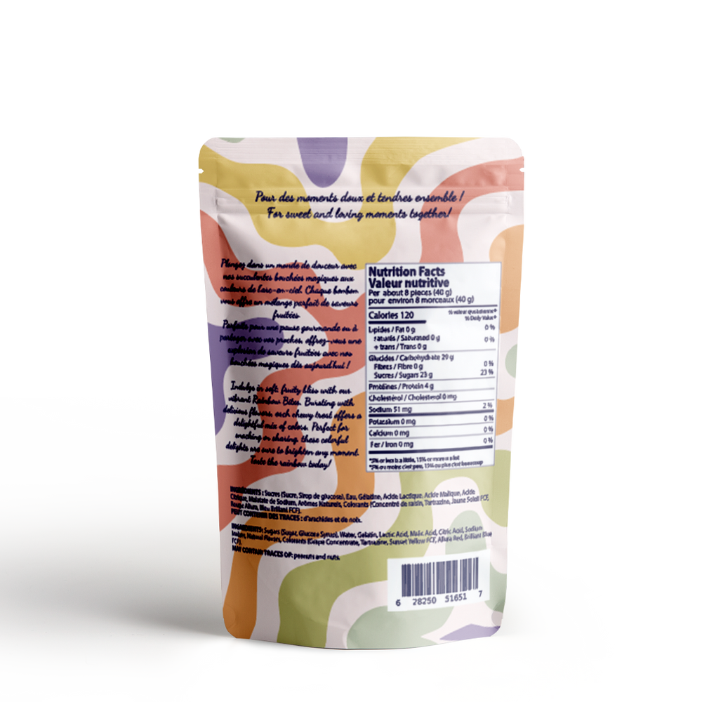 These delicious rainbow fruity bites have a distinctive texture, somewhat reminiscent of marshmallows. Flavors are fruity such apples, red berries and grapes.