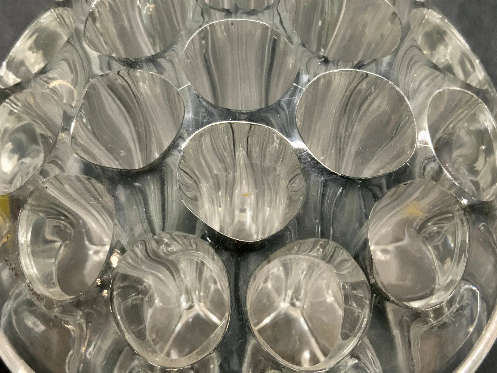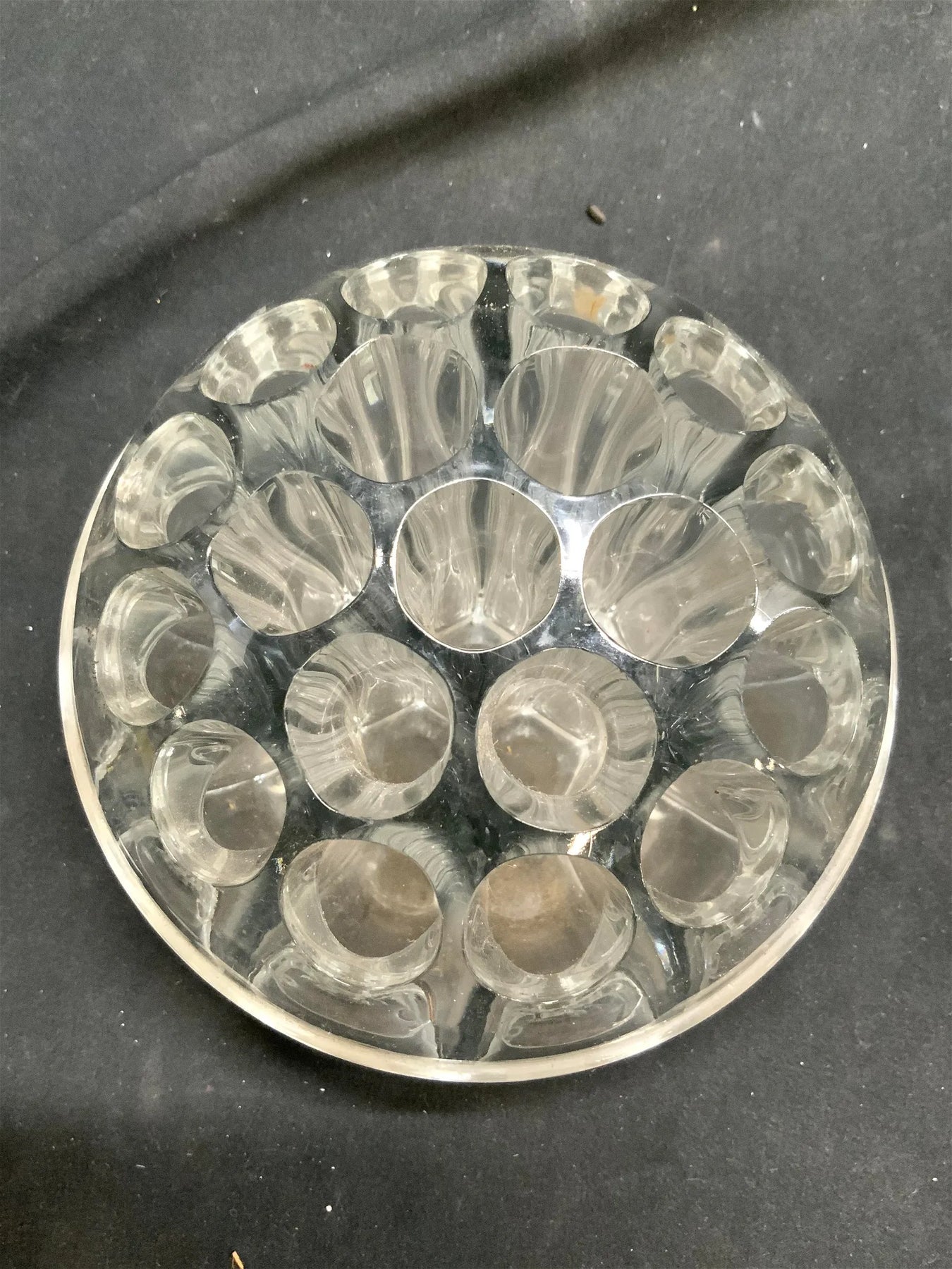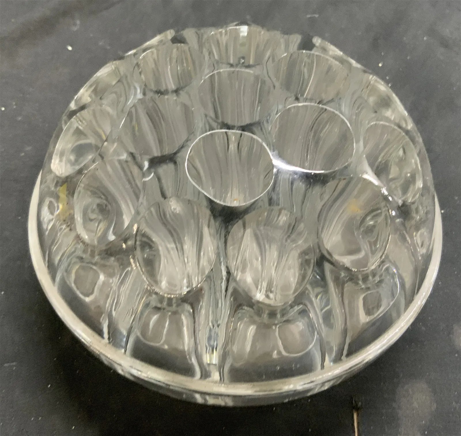 Flower frog is vintage. Piece is glass. Flower frog has 19 spaces to hold flowers. Underside has 6 small feet. Flower frog measures approx 5.5 inches wide 3.5 inches tall.