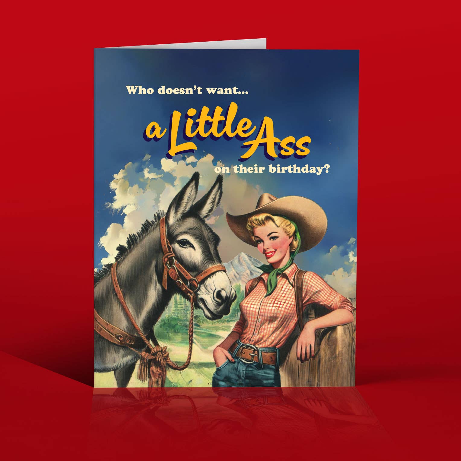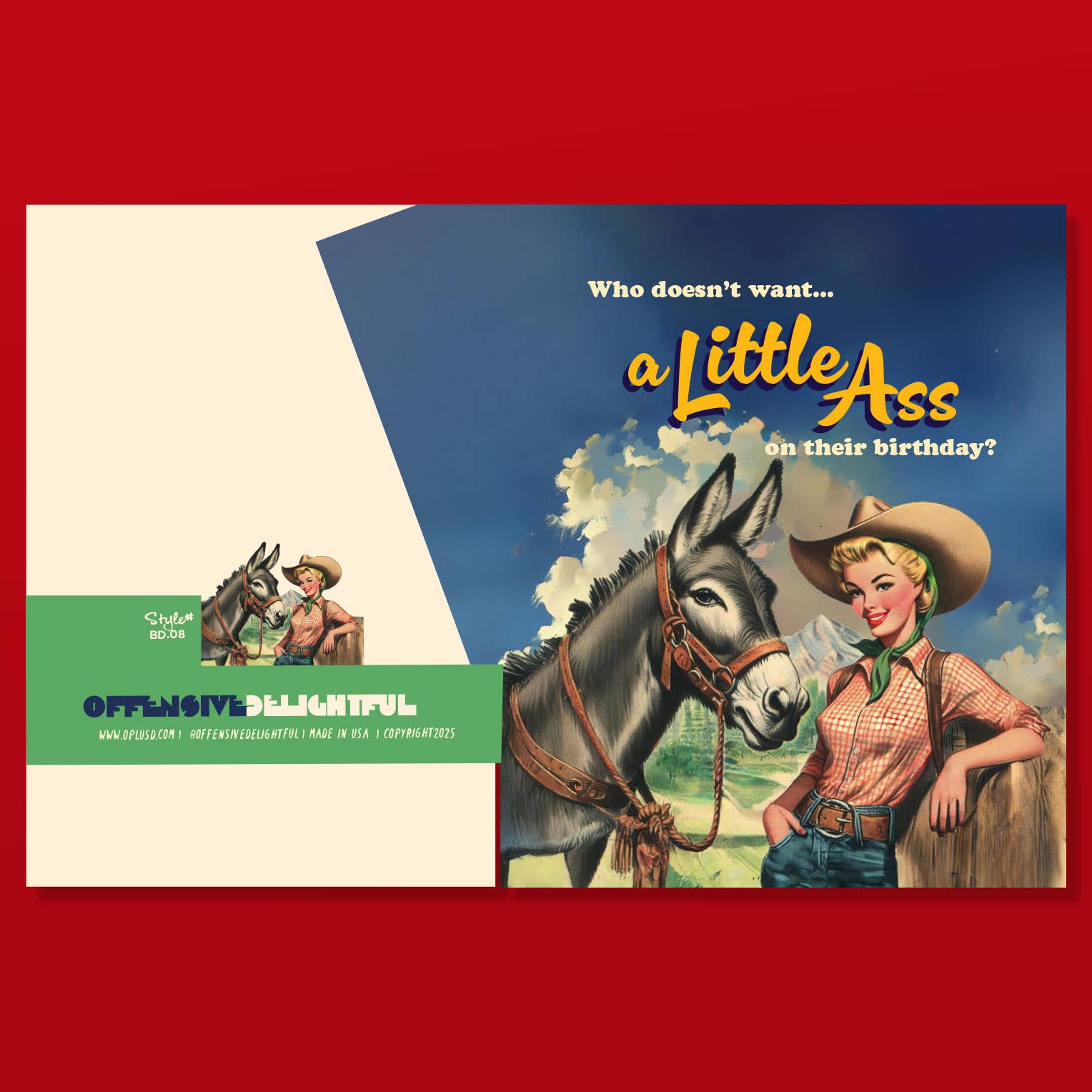 "Who doesn't want a little Ass for their birthday?" Style No. BD08 birthday card, sexy greetings, love, silly, donkey, animals, cute, funny birthday card
