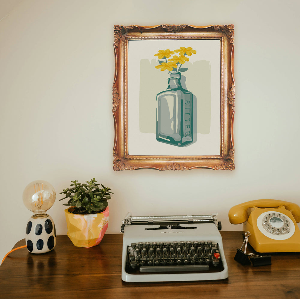 I've got a lot of bottles laying around my studio that look like this... I don't know why... anyway, I love the way shapes take form through the heavy glass and thought it would make a great kit. I also loved the idea of riffing off a bitters bottle and the delicious irony of making that into a vase for flowers. Kit Includes • 12" x 16" Art Template on 100% Cotton Paper • 9 Custom mixed colors • 4 Premium nylon brushes