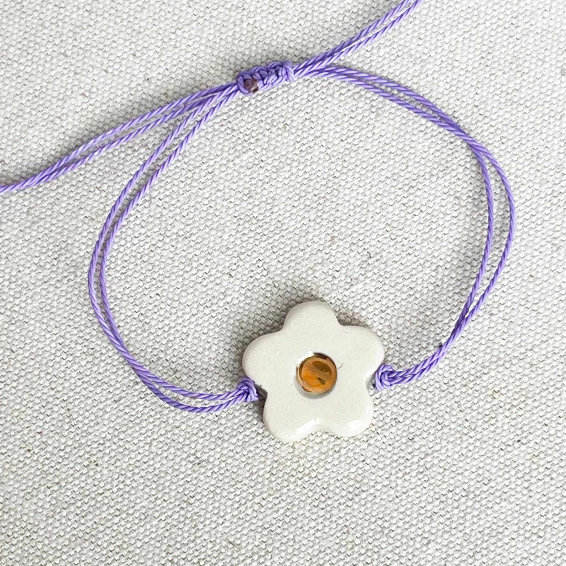 A whimsical accesory that will spark joy and optimism throughout your day. At the heart of this joyfull bracelet lies a carefully crafted daisy shaped charm handmade in porcelain and finished with 24K gold luster. The charm is set on waxed thread that is adjustable in size thanks to its clever sliding knot, fitting almost any size of wrist or even ankles. Note: Each piece is lovingly handmade, and due to the unique nature of the materials and craftsmanship, slight variations may occur, making your piece truly one-of-a-kind.