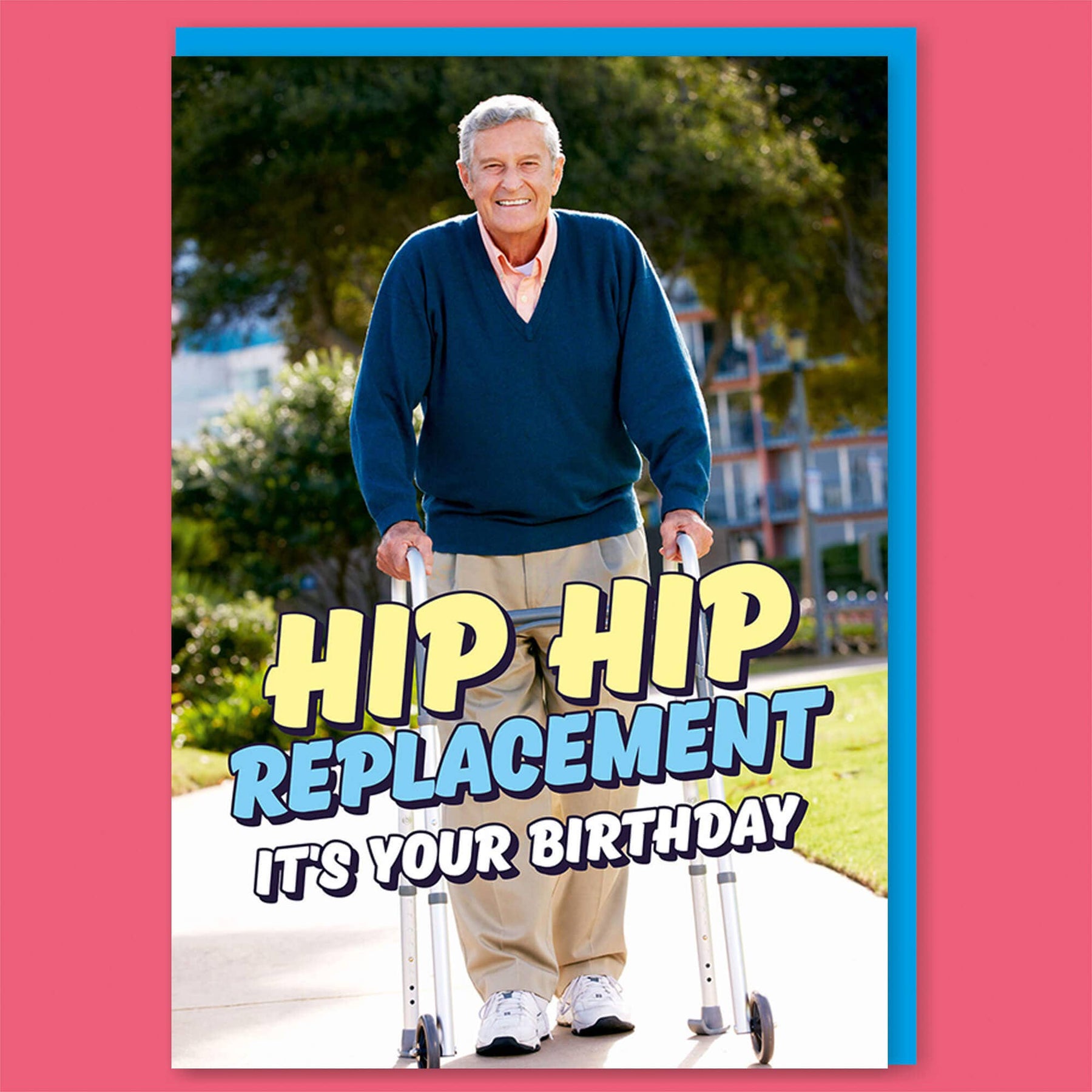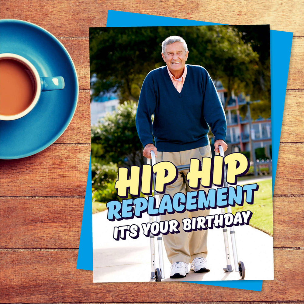 Old age creeps up on all of us, just make sure this Birthday no one ends up dancing on tables or a hip replacement might be an extra present they weren't expecting. A birthday card with a picture of a smiling old man using a walking frame. Blue, yellow and white text in front reads Hip hip replacement it's your birthday.