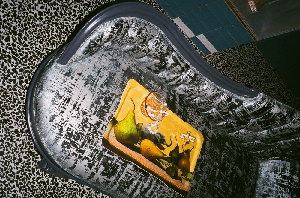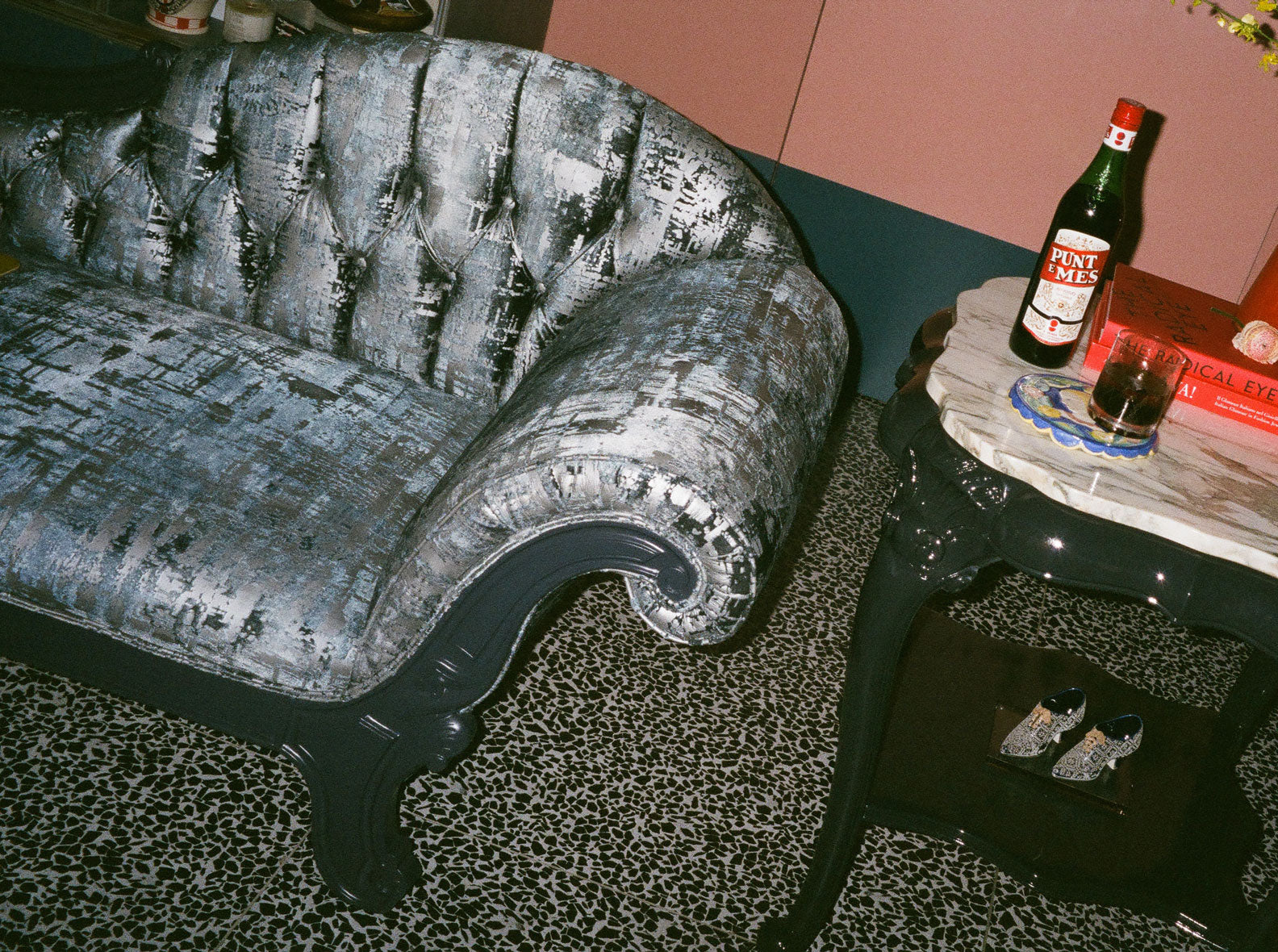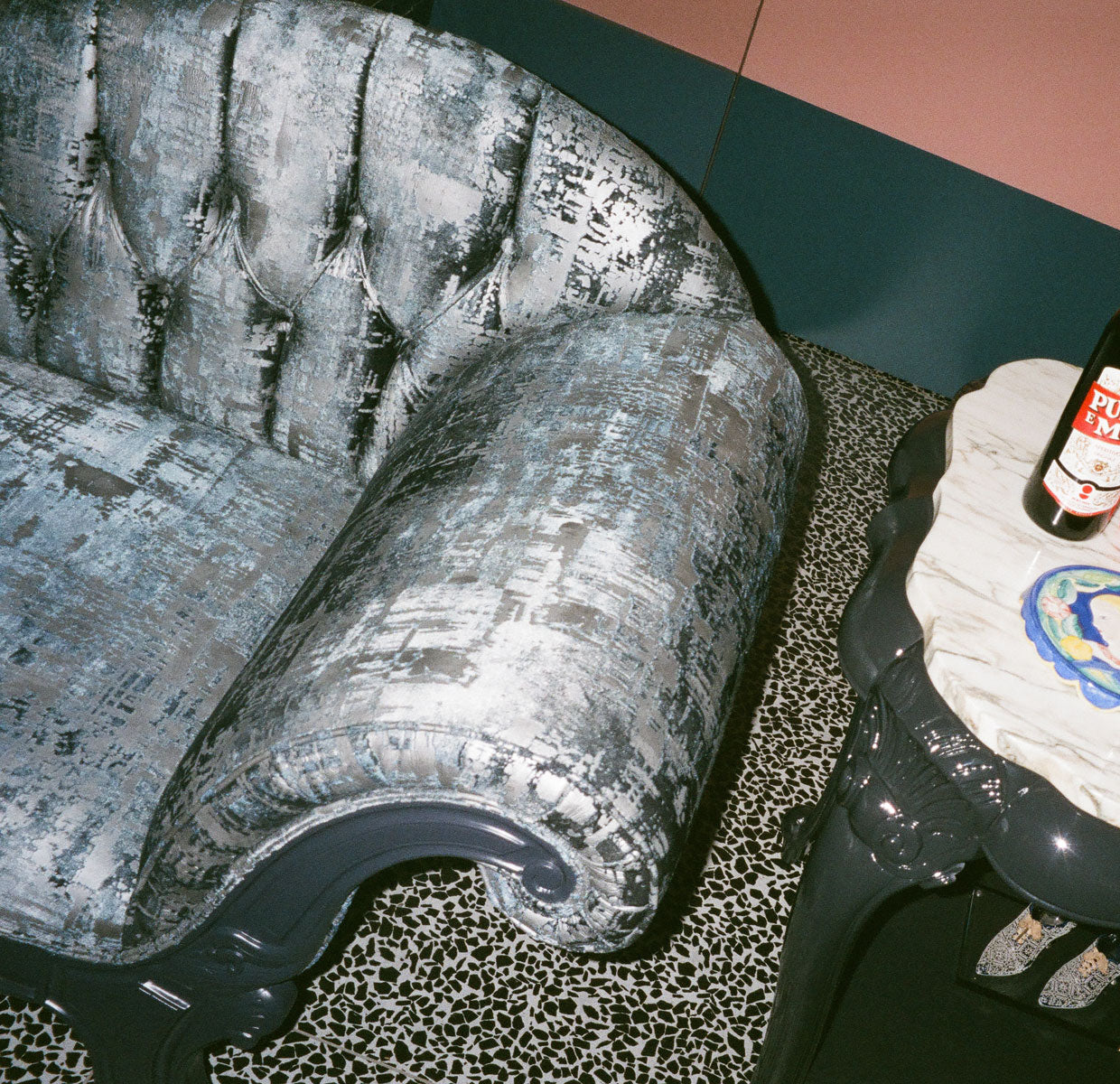 Late Victorian Carved Mahogany Recamier, Reupholstered with Knoll "Chiseled" upholstery and painted with Benjamin Moore "Evening sky" in a Brooklyn, NY workshop.