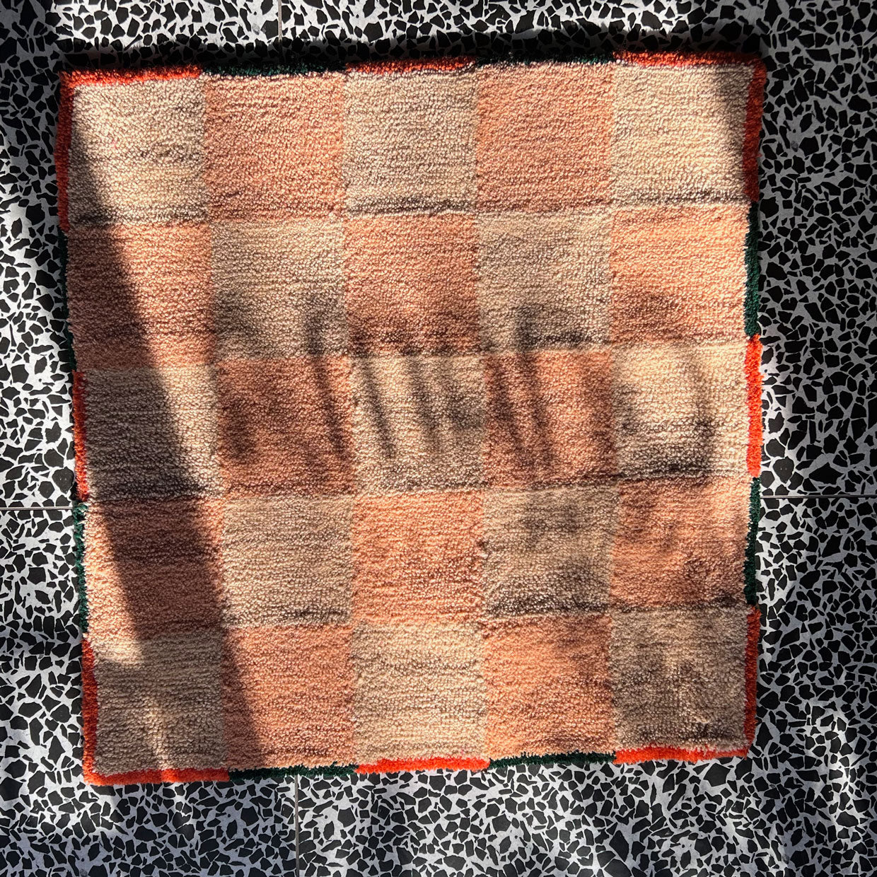 Checkered patterns available in "traffic cone and white checkers with pistachio and pale blue edges" or "stucco and peach checkers with burnt orange and forrest green edges".