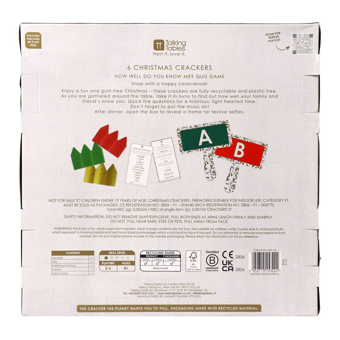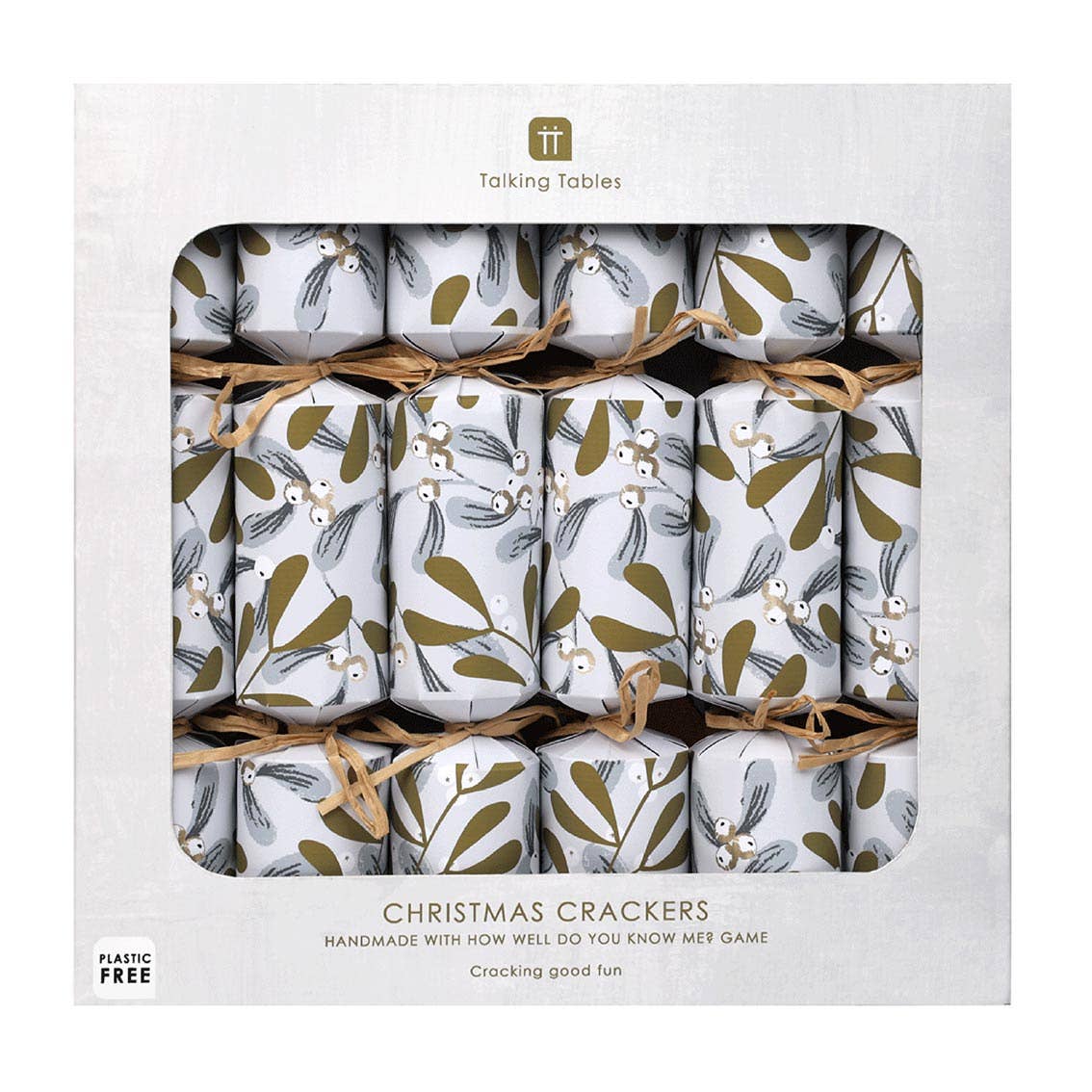 Bring elegance to the holiday table with these white Christmas crackers featuring a mistletoe design with gold and silver accents. Each cracker contains a paper crown, joke, and “How Well Do You Know Me” game with six paddles and cards. Made from FSC-certified paper and 100% plastic-free, the box also includes a QR code linking to a festive playlist and doubles as a photo frame for fun holiday moments. Size: 30cm Pack Info: Pack of 6 Material: Paper Why your customers will love this: * Stylish mistletoe design with foil accents * Includes party game, crown, and joke * Plastic-free and FSC-certified * Playlist QR and photo frame packaging Product: Home Recyclable Packaging: Widely Recycled Recommended Occasions: Christmas Recommended Retailers: Gift Stores Home & Interior Stores Garden Centers Delicatessens Florists People also consider: Christmas crackers, holiday table decor, festive games, eco-friendly crackers, mistletoe party supplies