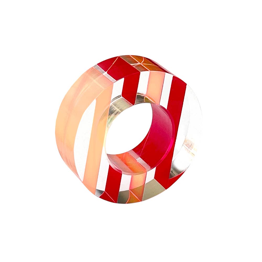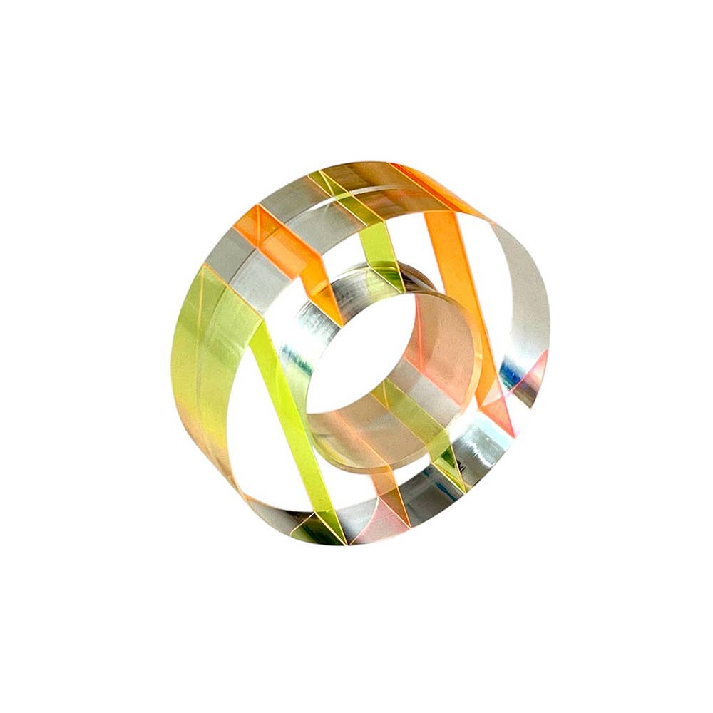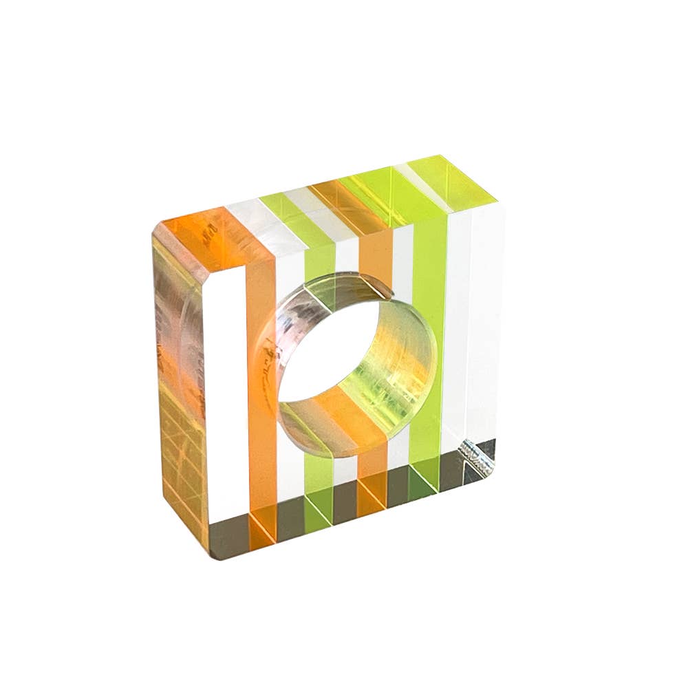 These lively, unique Napkin Rings adapt to any table setting. They come in a set of four pieces and are 2" wide. Safe, shatterproof layered acrylic, made with a unique process of layered acrylic. Easy to care for, simply wipe if necessary with a soft, damp cloth. Available in 4 color combinations in Square or Round. Galactic purple-blue layers for a stellar style, sunny yellow-orange slices to brighten your space, oceanic blue-green make a decorative splash, and deep red-orange hues that will glow through the home. Complete your table set and house decor with CANETTI® Napkin Rings, Vase, and Candle Holders. Do not put Napkin Rings in dishwasher.