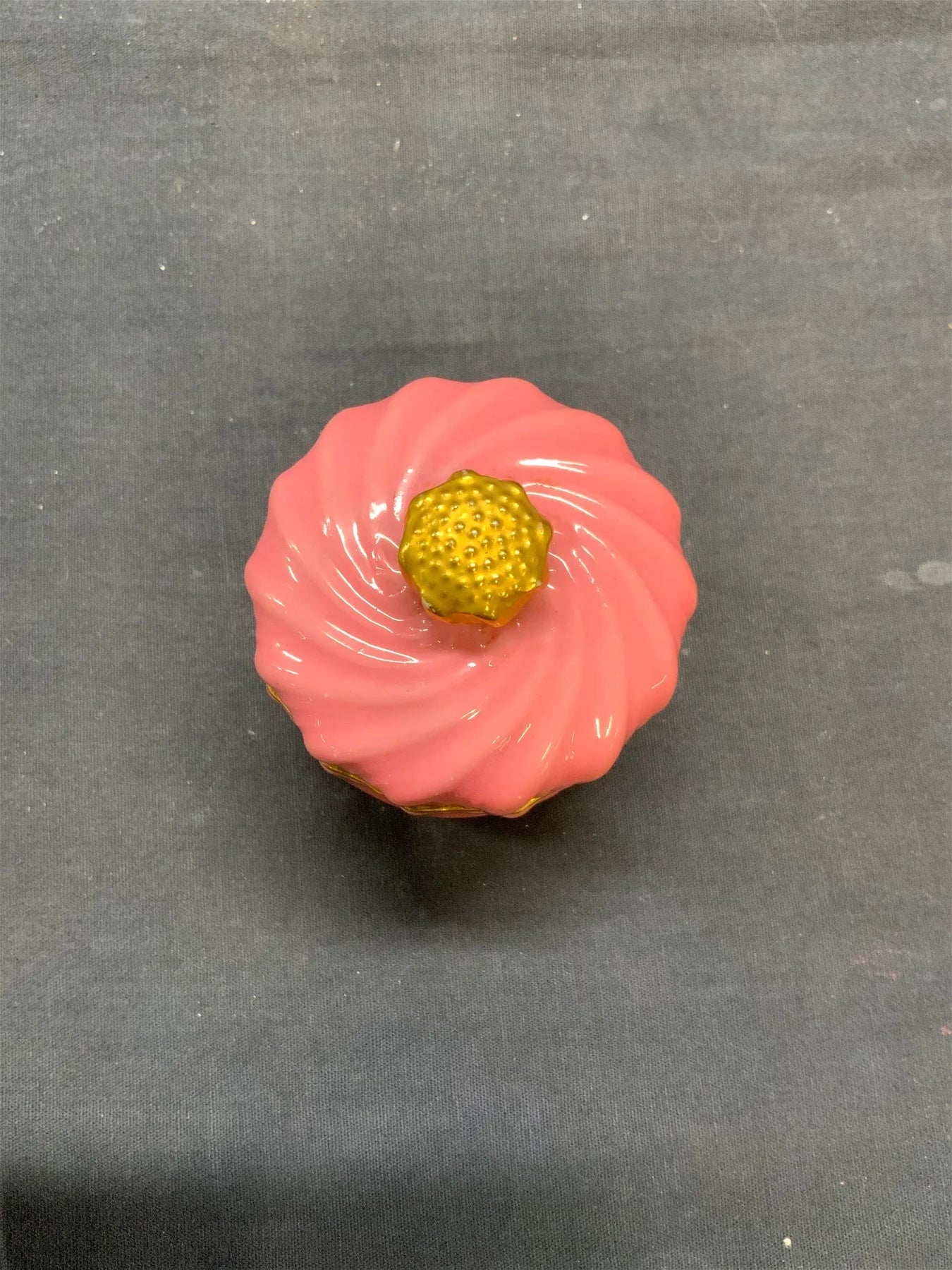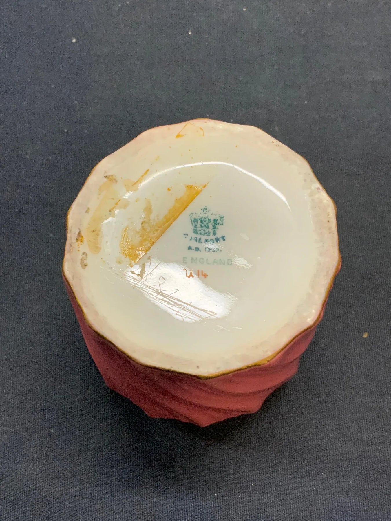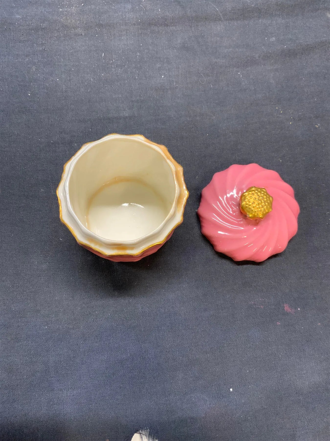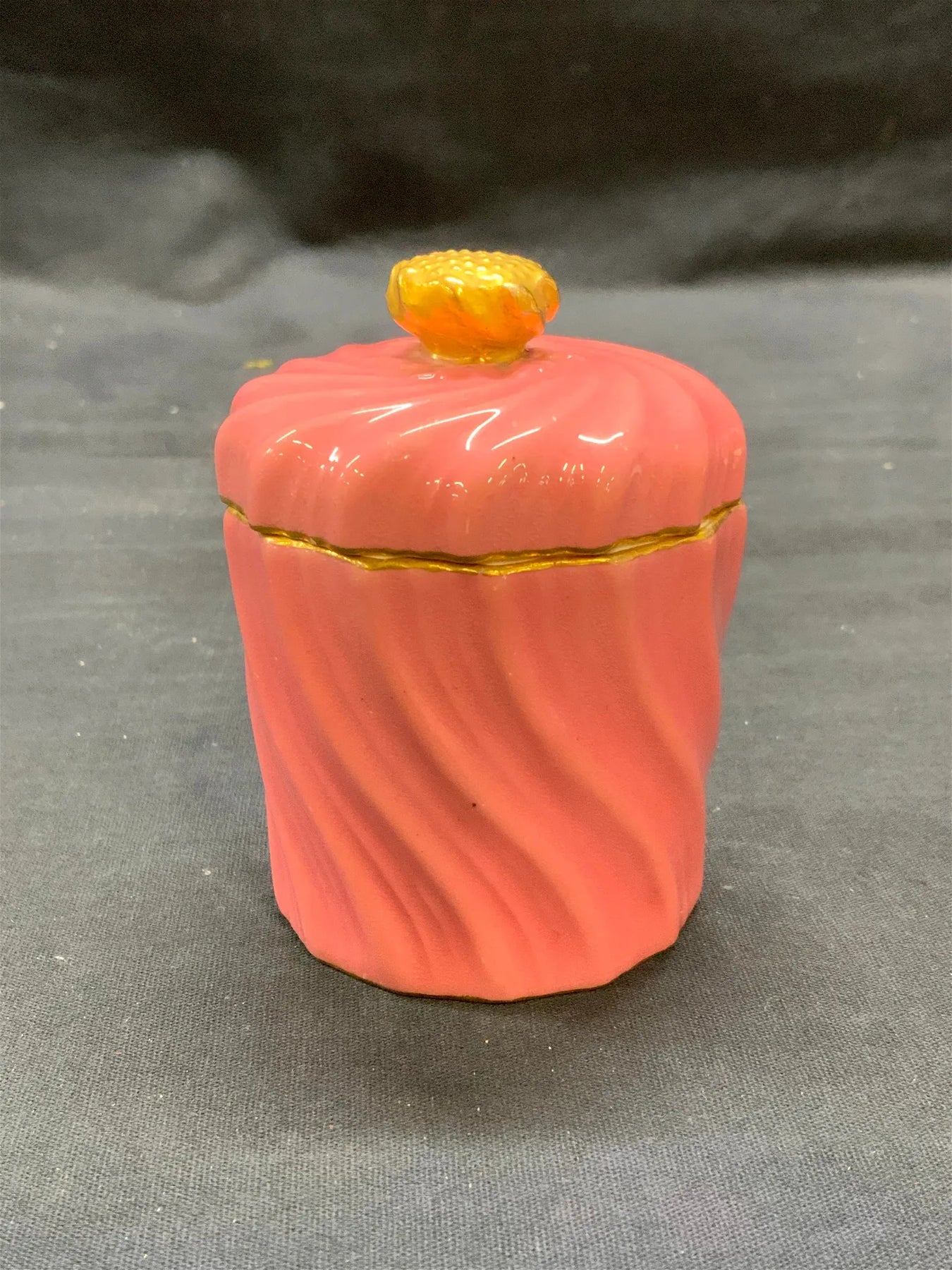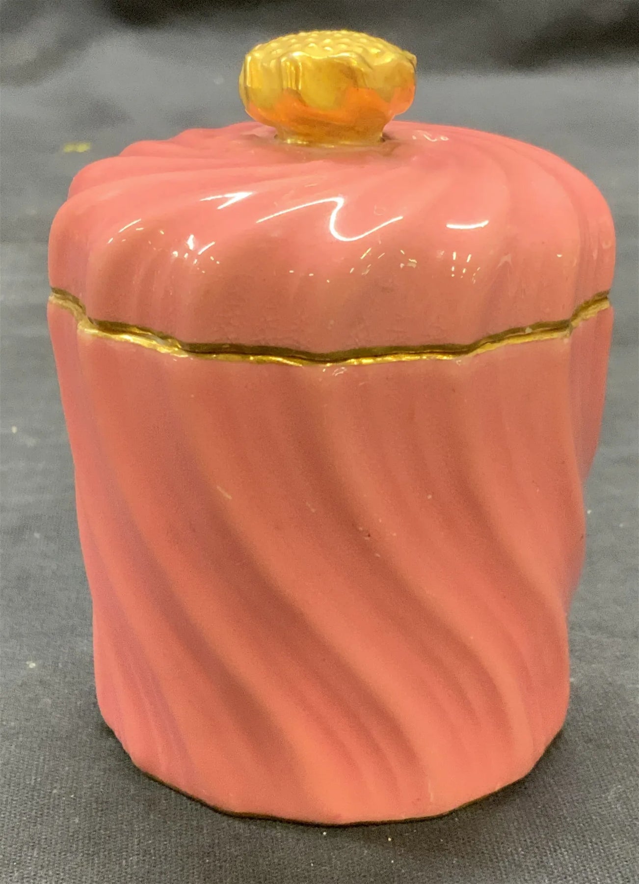 Vintage Coalport porcelain lidded box in pink with gilt decoration. Swirled raised detail. Trademarked to underside. Made in England. Measures approx. 2.5 x 3.5 inches. Some surface wear including scratching observed.