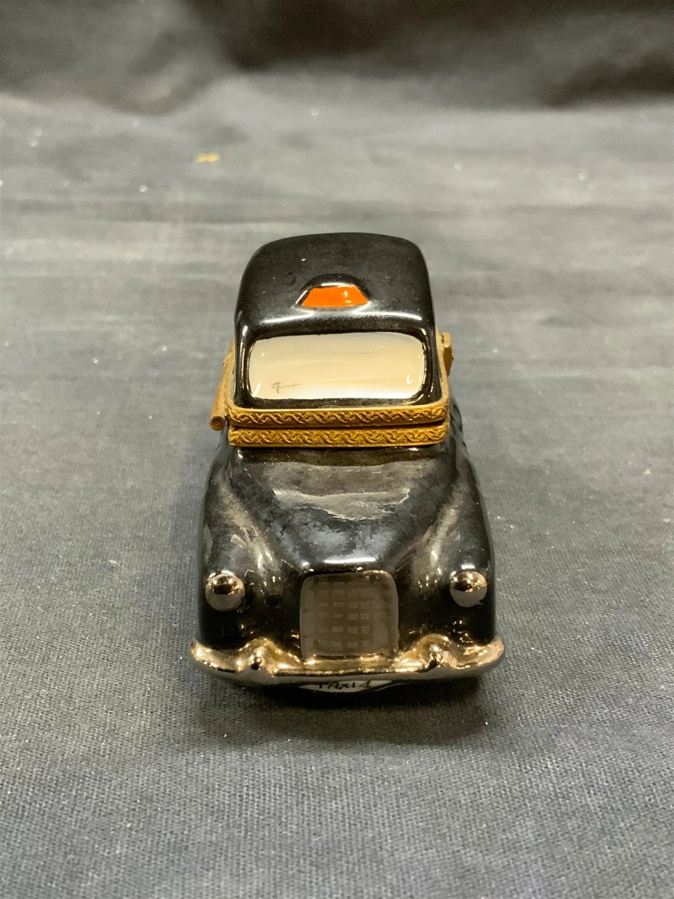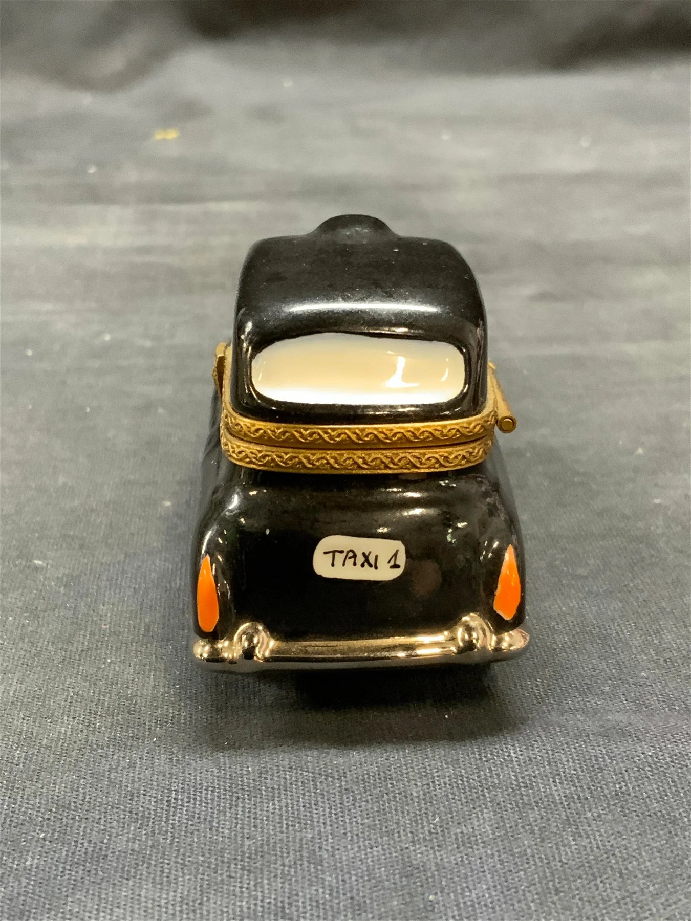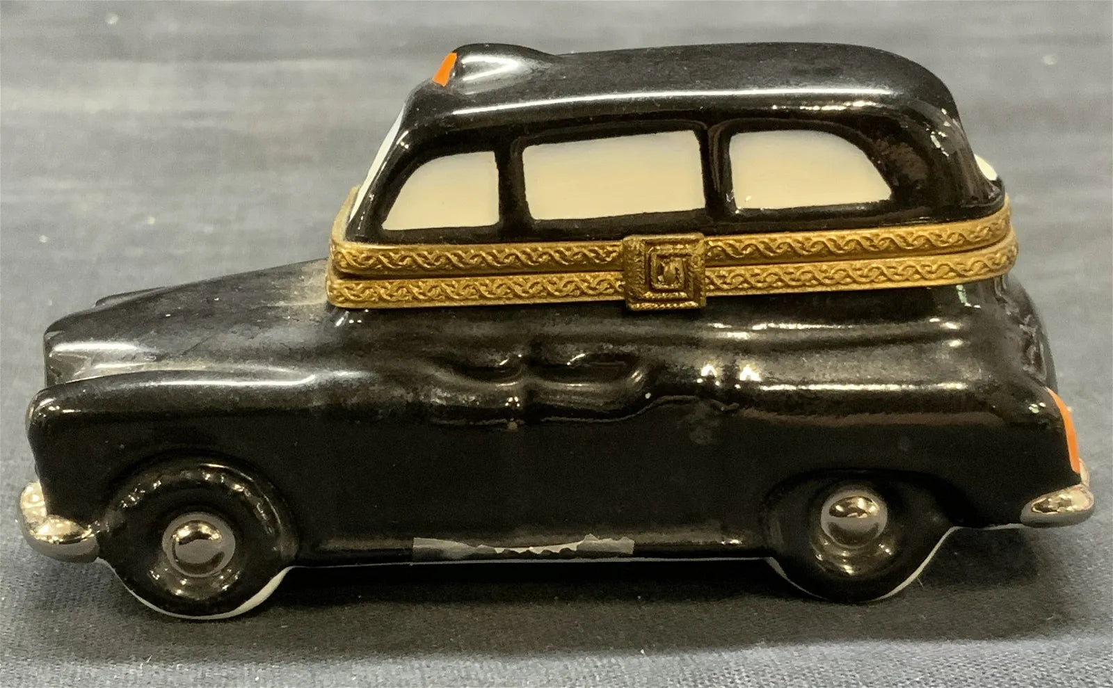Vintage Limoges porcelain taxi motif trinket box. Hand painted in black and white. Raised brass frame and latch. Trademarked to underside. Made in France. Measures approx. 3.75 x 1.5 x 1.75 inches. Some surface wear including scratching observed.