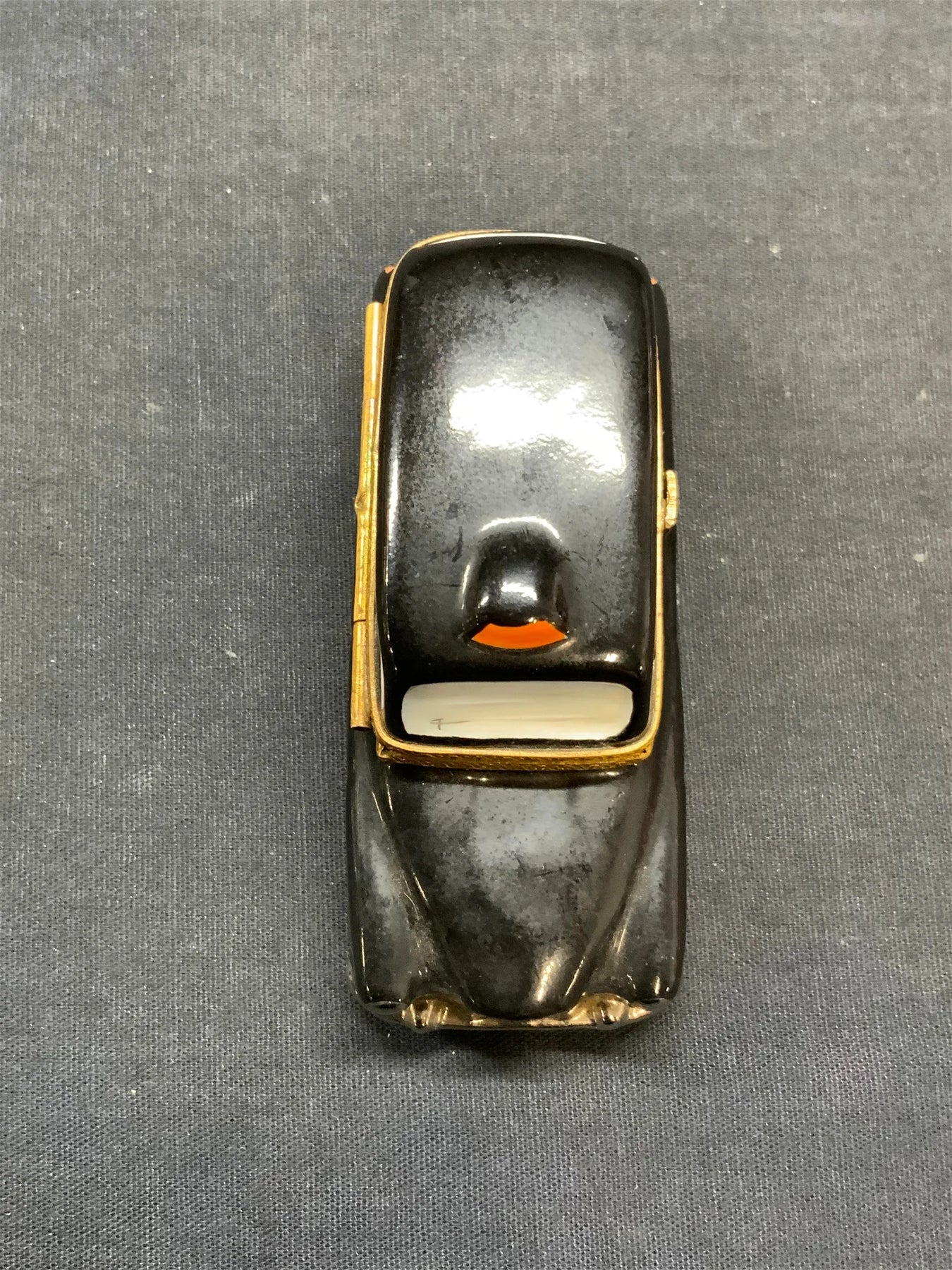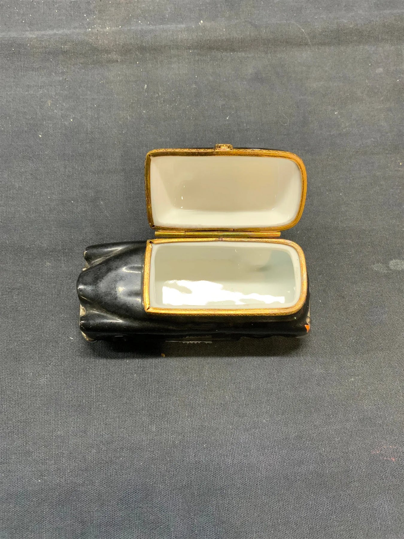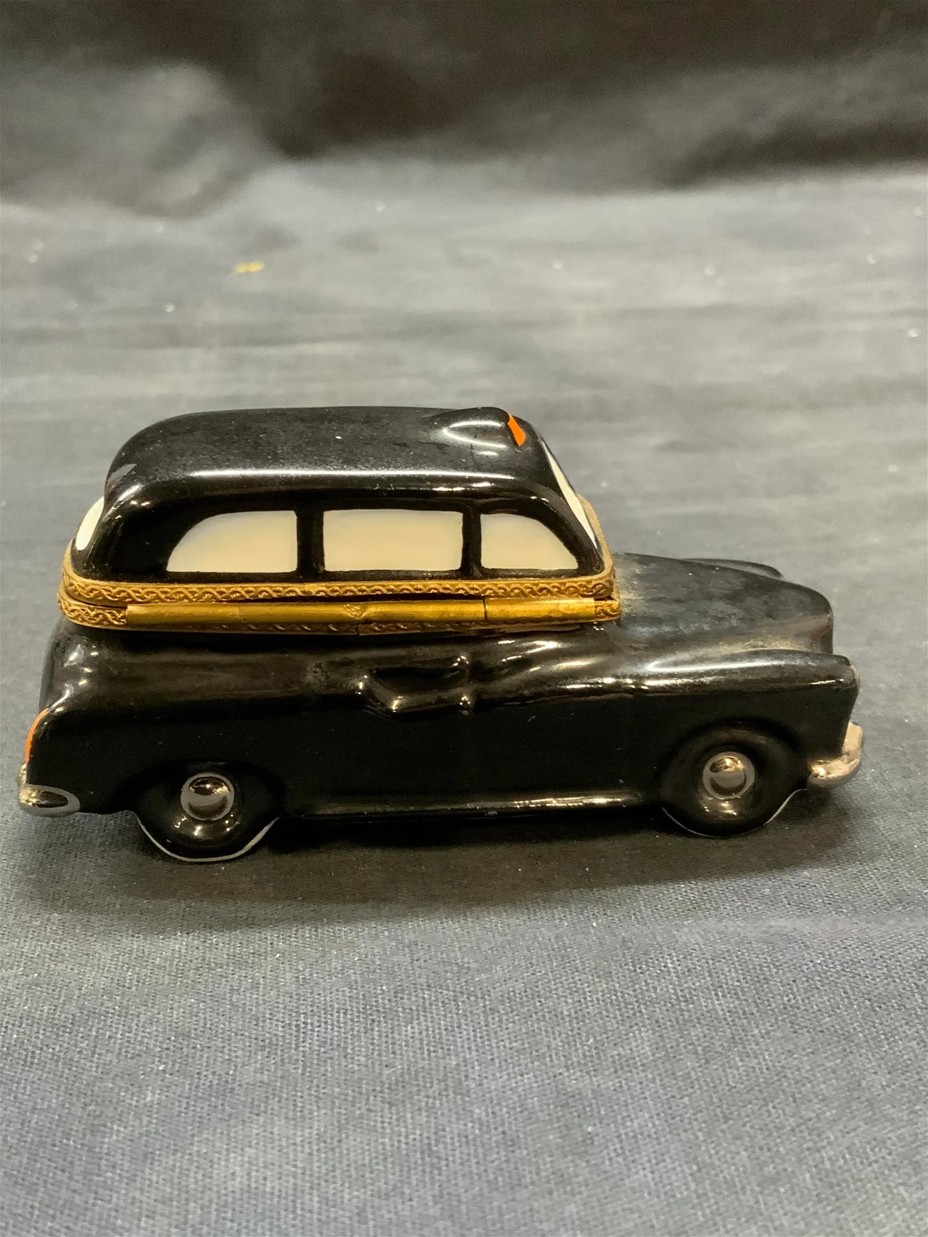 Vintage Limoges porcelain taxi motif trinket box. Hand painted in black and white. Raised brass frame and latch. Trademarked to underside. Made in France. Measures approx. 3.75 x 1.5 x 1.75 inches. Some surface wear including scratching observed.
