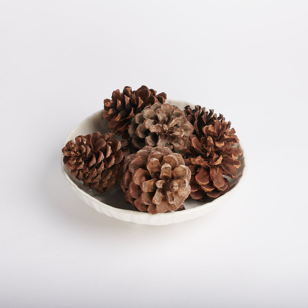 For favorites like fresh pine cones or candy this bowl serves texture. Perfect for a hallway console or for your favorite side dish at dinner. White stoneware. Dishwasher safe.